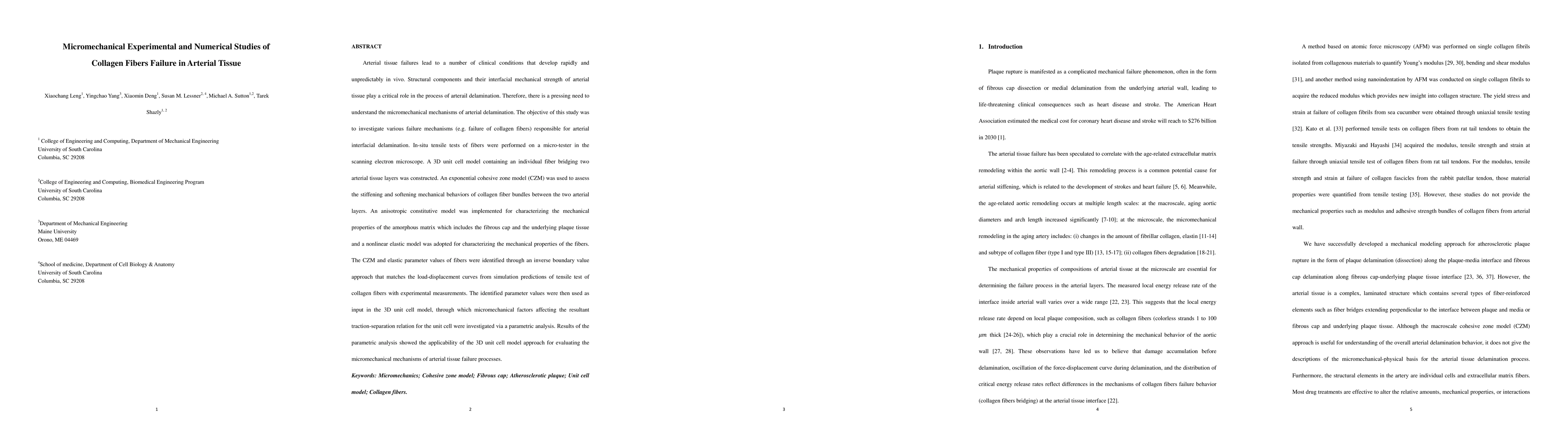 This study investigates the micromechanical mechanisms of arterial delamination by examining collagen fiber failure using in-situ tensile tests and a 3D unit cell model. An exponential cohesive zone model and anisotropic constitutive models were employed to characterize the mechanical behavior of collagen fibers and the amorphous matrix, respectively. The identified parameters were used to evaluate micromechanical factors influencing the traction-separation relation, demonstrating the model's effectiveness in understanding arterial tissue failure.
