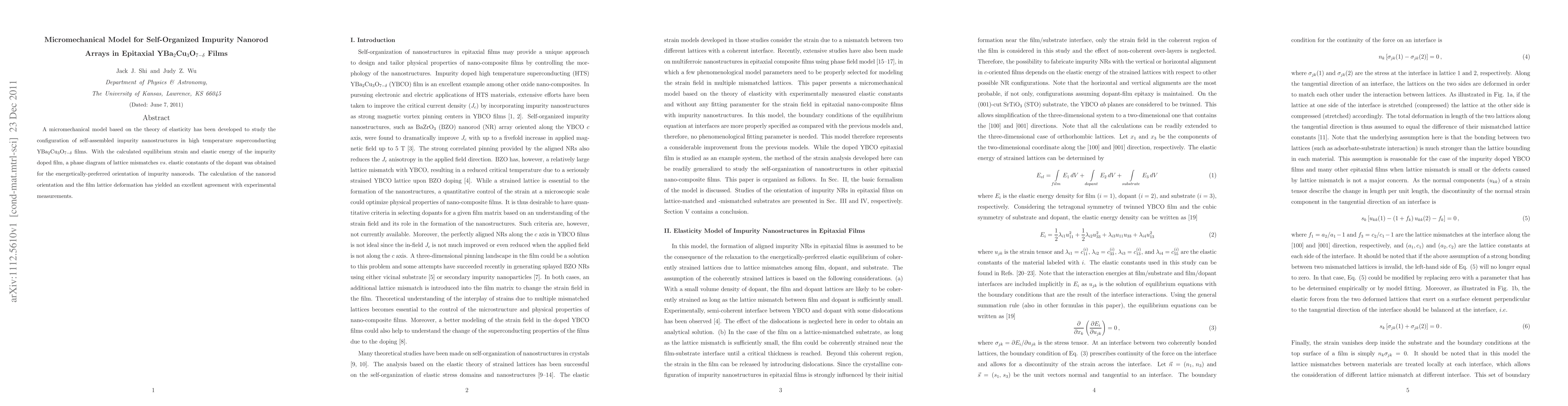 A micromechanical model based on the theory of elasticity has been developed to study the configuration of self-assembled impurity nanostructures in high temperature superconducting YBCO films. With the calculated equilibrium strain and elastic energy of the impurity doped film, a phase diagram of lattice mismatches $vs.$ elastic constants of the dopant was obtained for the energetically-preferred orientation of impurity nanorods. The calculation of the nanorod orientation and the film lattice deformation has yielded an excellent agreement with experimental measurements.