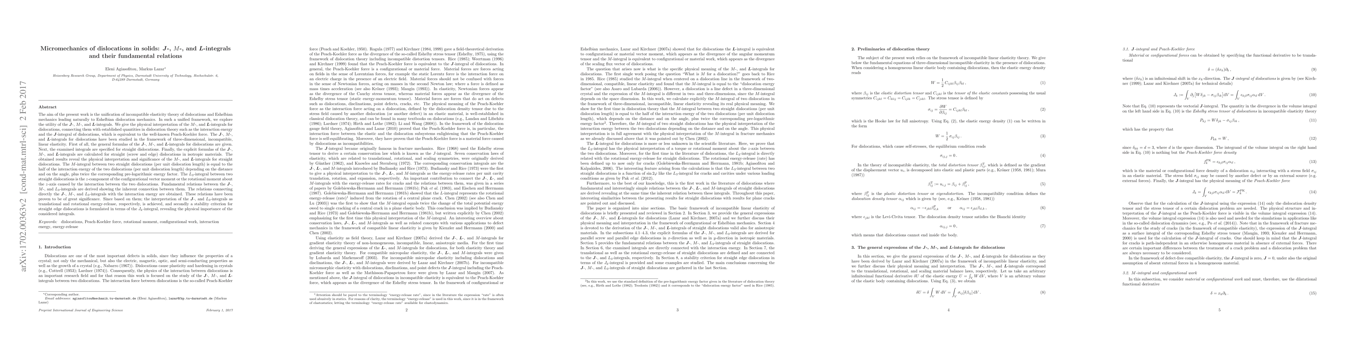 This paper unifies the elasticity theory of dislocations with Eshelbian mechanics to develop Eshelbian dislocation mechanics, exploring the $J$-, $M$-, and $L$-integrals. It provides physical interpretations for the $M$ and $L$ integrals, connecting them to the interaction energy and Peach-Koehler force, and derives fundamental relations between these integrals.