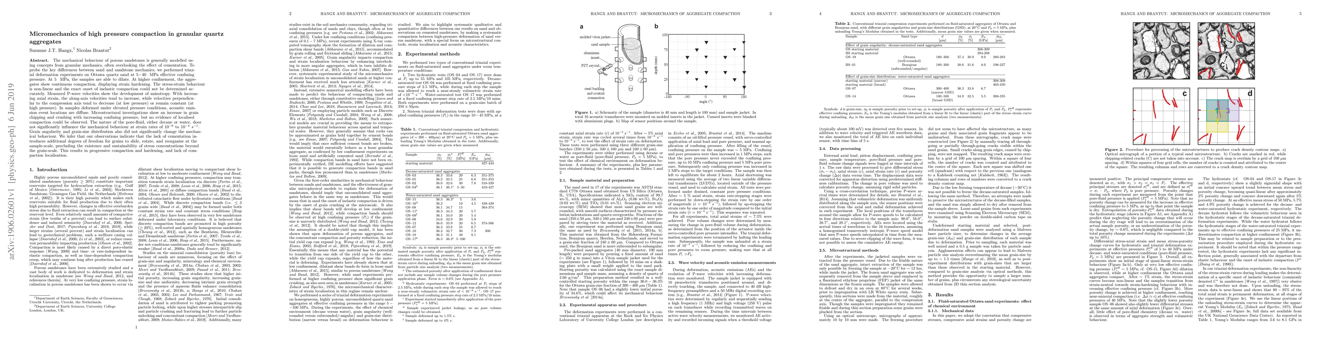 This study investigates the micromechanics of high-pressure compaction in granular quartz aggregates, revealing that uncemented quartz sand exhibits continuous compaction and strain hardening under elevated confining pressures, with no localized compaction. The mechanical behavior is unaffected by pore-fluid type or grain characteristics, suggesting that the lack of cementation allows grains to slide and reorganize, leading to progressive compaction.