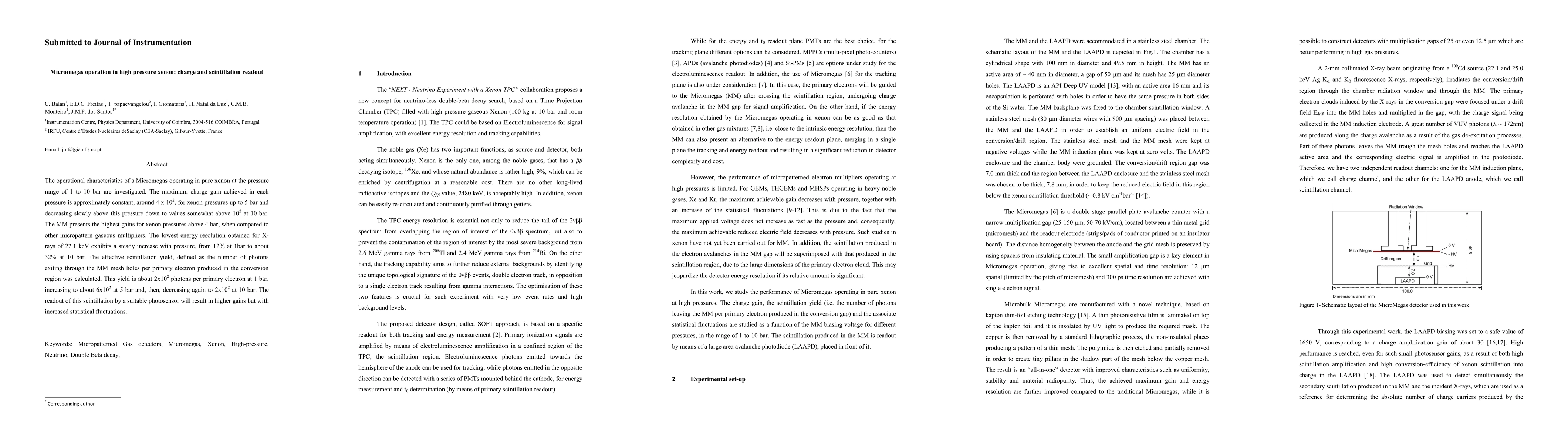 This study investigates Micromegas performance in pure xenon gas at pressures from 1 to 10 bar, finding stable charge gain up to 5 bar, decreasing thereafter. The effective scintillation yield increases up to 5 bar but declines at higher pressures, suggesting potential for enhanced detection with photosensors despite increased fluctuations.