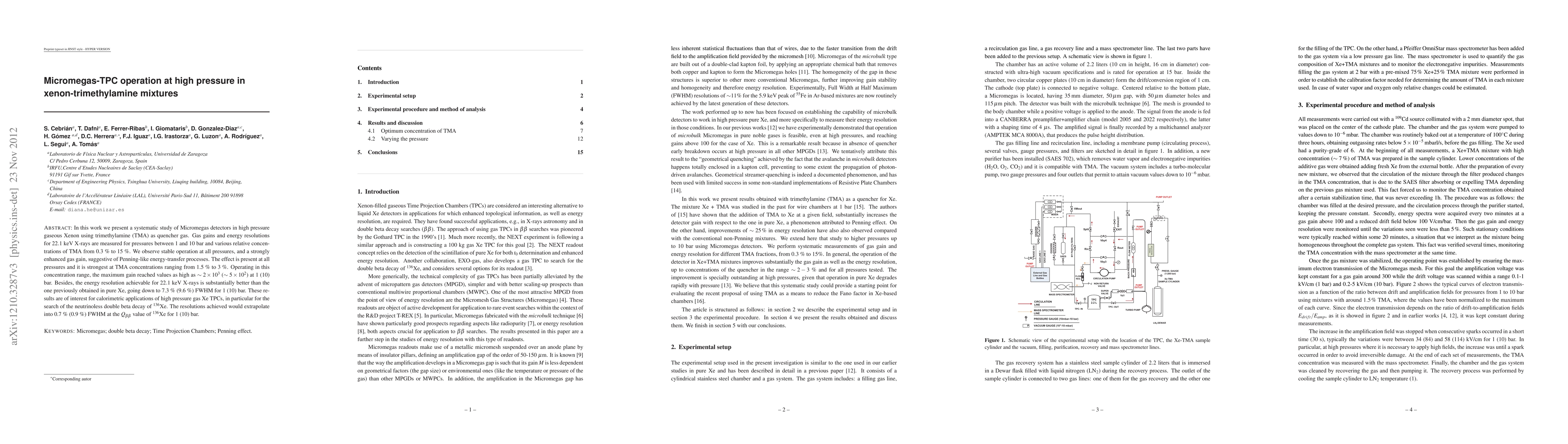 This study investigates the performance of Micromegas detectors in high pressure xenon-trimethylamine mixtures, showing stable operation and significantly enhanced gas gains, especially at TMA concentrations between 1.5% and 3%. The energy resolution for 22.1 keV X-rays is notably better than in pure xenon, with implications for neutrinoless double beta decay searches.