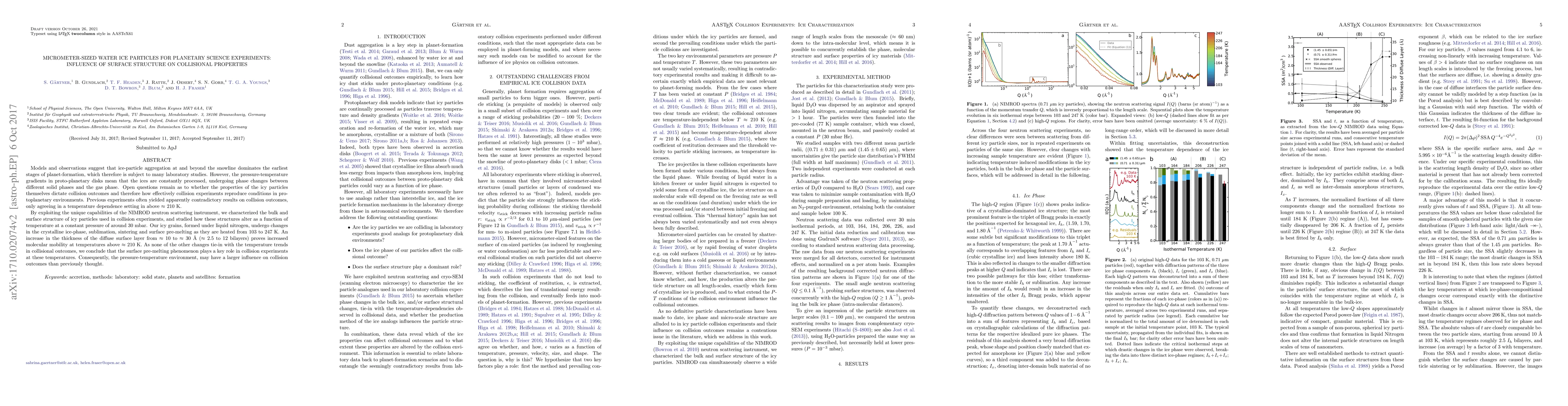 Models and observations suggest that ice-particle aggregation at and beyond the snowline dominates the earliest stages of planet-formation, which therefore is subject to many laboratory studies. However, the pressure-temperature gradients in proto-planetary disks mean that the ices are constantly processed, undergoing phase changes between different solid phases and the gas phase. Open questions remain as to whether the properties of the icy particles themselves dictate collision outcomes and therefore how effectively collision experiments reproduce conditions in pro- toplanetary environments. Previous experiments often yielded apparently contradictory results on collision outcomes, only agreeing in a temperature dependence setting in above $\approx$ 210 K. By exploiting the unique capabilities of the NIMROD neutron scattering instrument, we characterized the bulk and surface structure of icy particles used in collision experiments, and studied how these structures alter as a function of temperature at a constant pressure of around 30 mbar. Our icy grains, formed under liquid nitrogen, undergo changes in the crystalline ice-phase, sublimation, sintering and surface pre-melting as they are heated from 103 to 247 K. An increase in the thickness of the diffuse surface layer from $\approx$ 10 to $\approx$ 30 {\AA} ($\approx$ 2.5 to 12 bilayers) proves increased molecular mobility at temperatures above $\approx$ 210 K. As none of the other changes tie-in with the temperature trends in collisional outcomes, we conclude that the surface pre-melting phenomenon plays a key role in collision experiments at these temperatures. Consequently, the pressure-temperature environment, may have a larger influence on collision outcomes than previously thought.