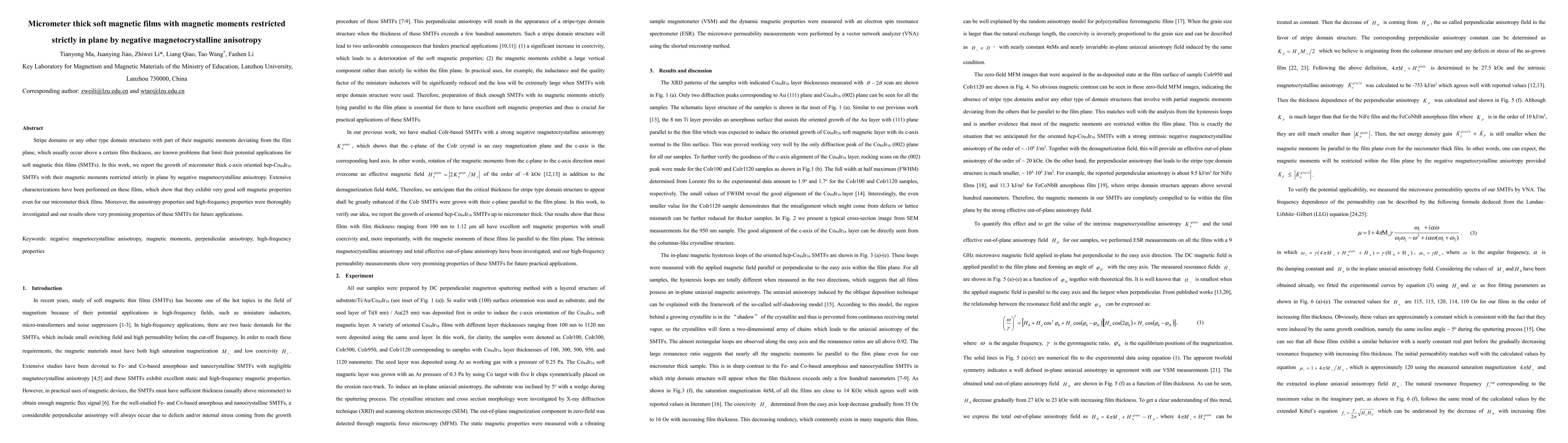 This paper reports the successful growth of micrometer-thick c-axis oriented hcp-Co84Ir16 soft magnetic thin films with magnetic moments strictly confined in-plane by negative magnetocrystalline anisotropy, avoiding stripe domain issues. The films exhibit excellent soft magnetic properties and promising high-frequency performance, indicating potential for future applications.