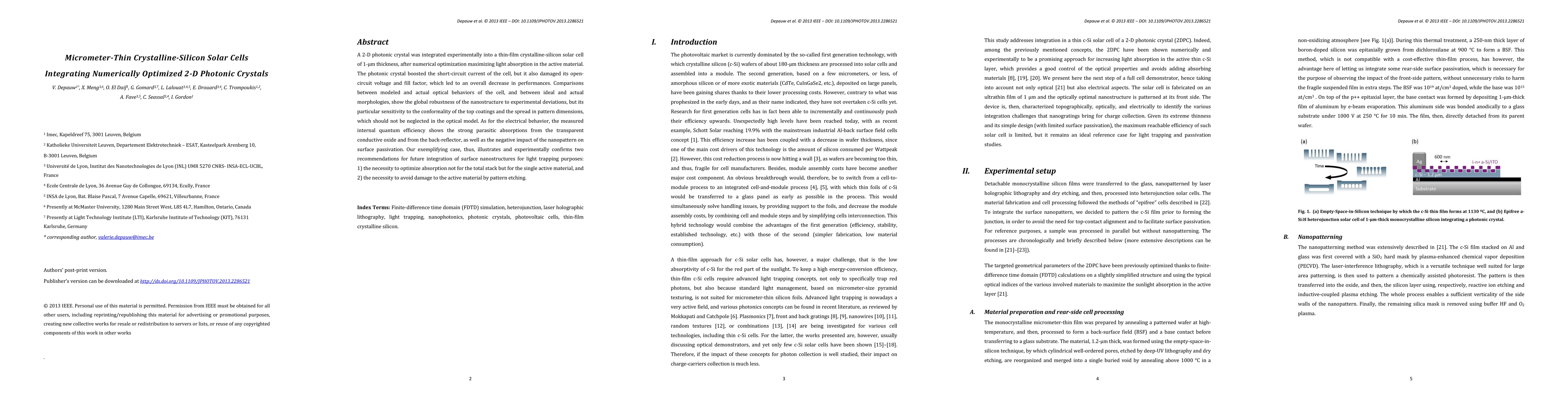 A 2-D photonic crystal was integrated experimentally into a thin-film crystalline-silicon solar cell of 1-{\mu}m thickness, after numerical optimization maximizing light absorption in the active material. The photonic crystal boosted the short-circuit current of the cell, but it also damaged its open-circuit voltage and fill factor, which led to an overall decrease in performances. Comparisons between modeled and actual optical behaviors of the cell, and between ideal and actual morphologies, show the global robustness of the nanostructure to experimental deviations, but its particular sensitivity to the conformality of the top coatings and the spread in pattern dimensions, which should not be neglected in the optical model. As for the electrical behavior, the measured internal quantum efficiency shows the strong parasitic absorptions from the transparent conductive oxide and from the back-reflector, as well as the negative impact of the nanopattern on surface passivation. Our exemplifying case, thus, illustrates and experimentally confirms two recommendations for future integration of surface nanostructures for light trapping purposes: 1) the necessity to optimize absorption not for the total stack but for the single active material, and 2) the necessity to avoid damage to the active material by pattern etching.