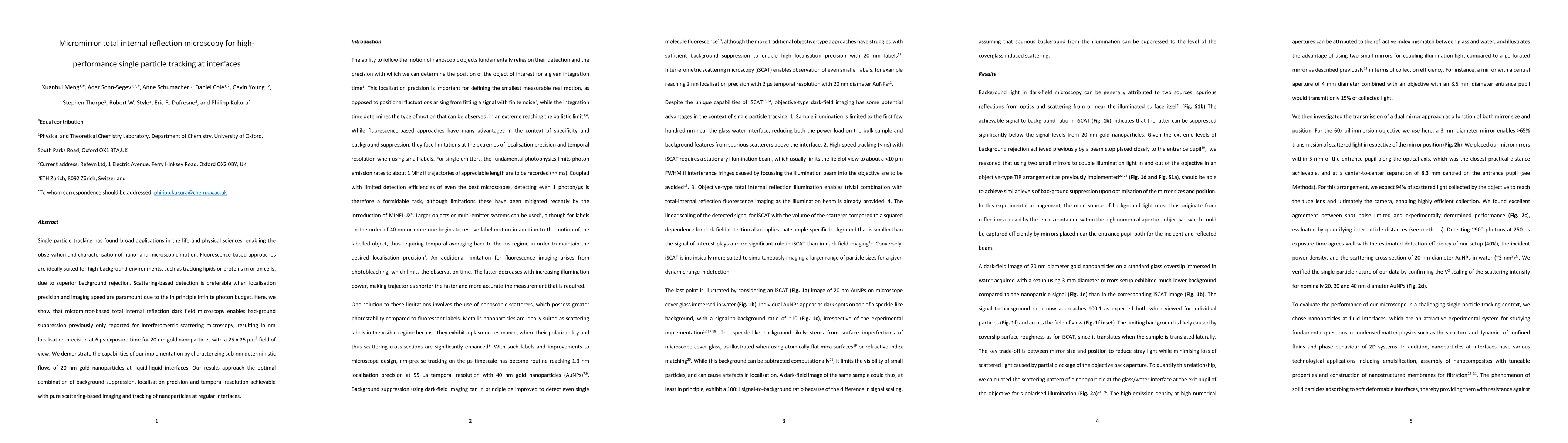 Micromirror total internal reflection dark field microscopy achieves nm-level precision and rapid imaging for single particle tracking, demonstrating near-optimal performance in background suppression and temporal resolution for nanoparticles at liquid-liquid interfaces. The technique combines the benefits of scattering-based detection with interferometric scattering microscopy’s background rejection capabilities.