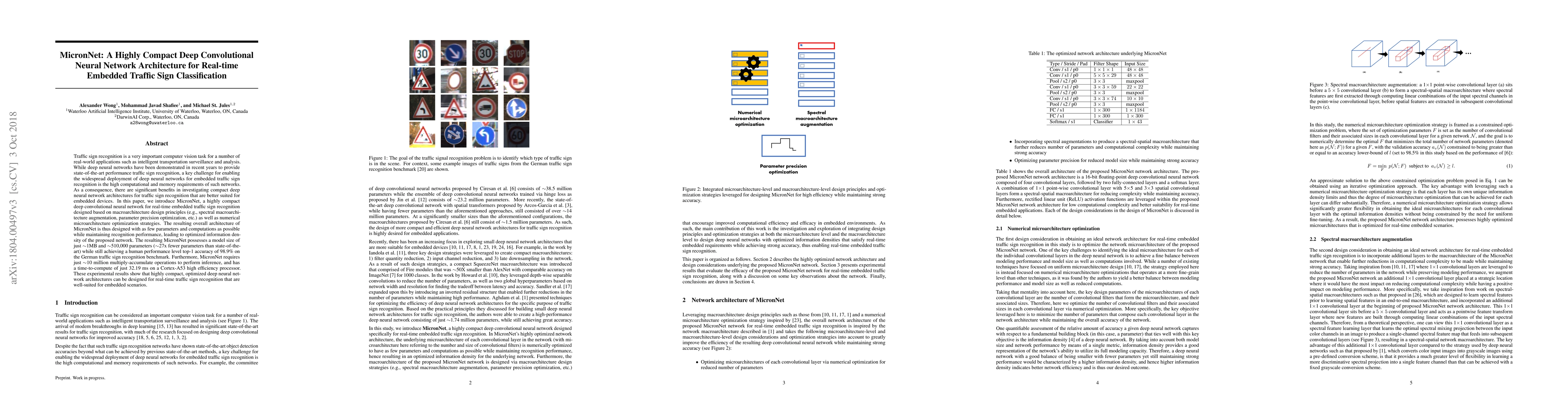 MicronNet introduces a highly compact deep convolutional neural network designed for real-time embedded traffic sign recognition, achieving 98.9% accuracy with just 1MB size and 510,000 parameters, significantly reducing computational load for efficient deployment in embedded systems.