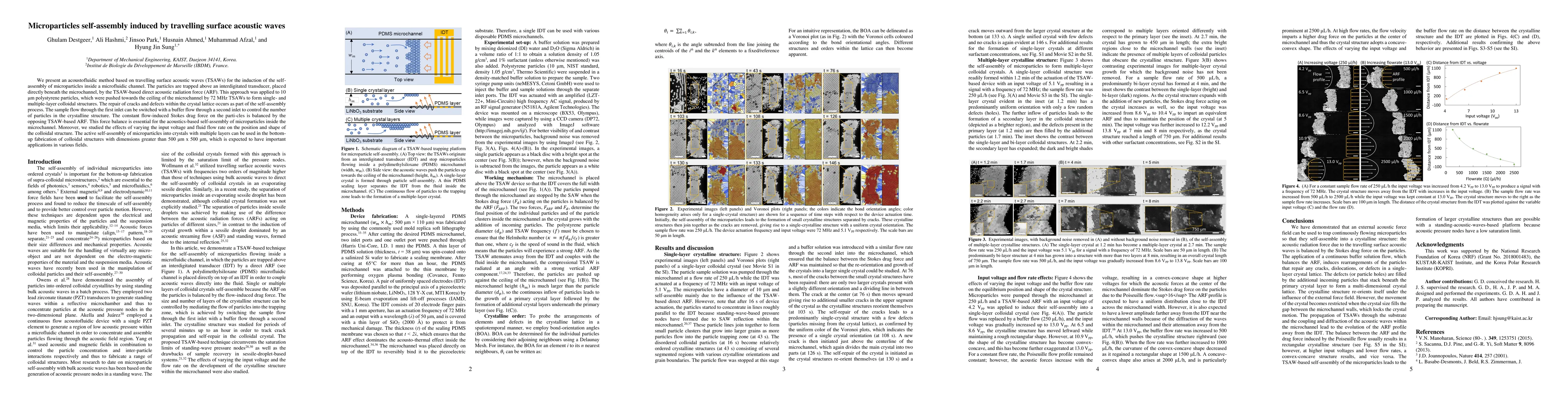 This paper introduces an acoustofluidic method using travelling surface acoustic waves to self-assemble microparticles into colloidal structures within a microfluidic channel. The method balances the TSAW-based acoustic radiation force with flow-induced Stokes drag to control particle assembly, enabling the creation of multi-layered crystals with potential applications in advanced fabrication.