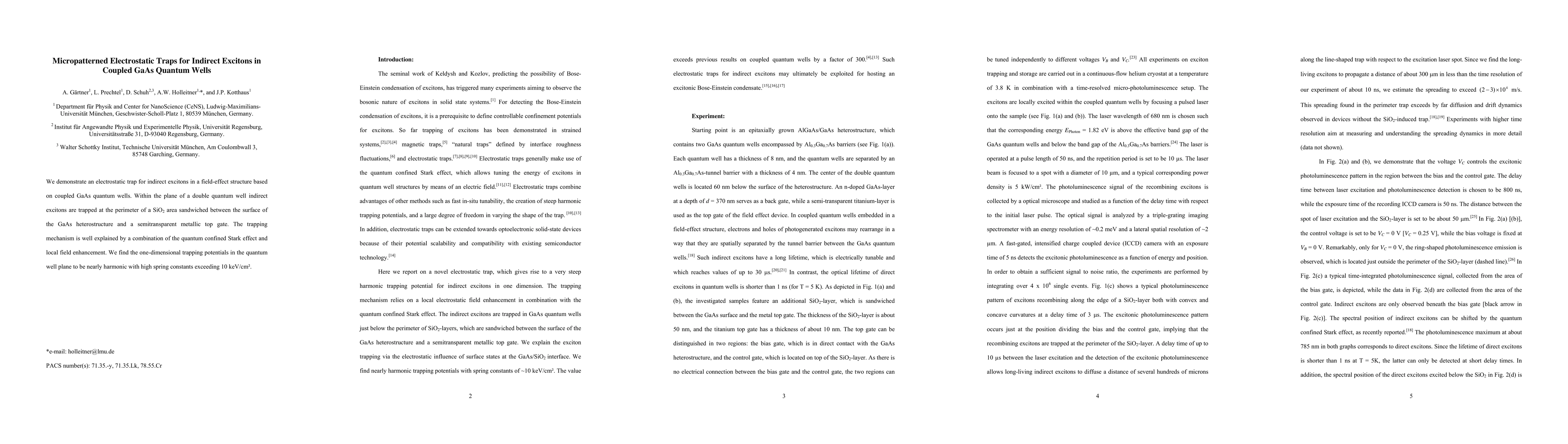 This research demonstrates an electrostatic trap for indirect excitons in coupled GaAs quantum wells using a field-effect structure, trapping them at the perimeter of a SiO2 area. The trapping mechanism combines the quantum confined Stark effect and local field enhancement, resulting in nearly harmonic one-dimensional potentials with high spring constants.