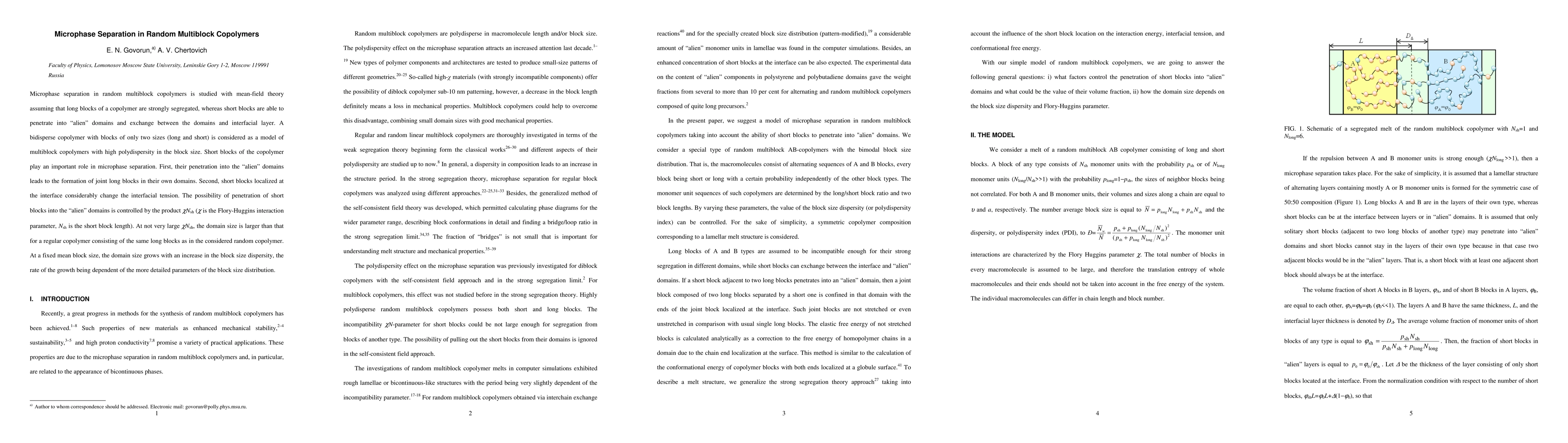 Microphase separation in random multiblock copolymers is studied using mean-field theory, focusing on bidisperse copolymers with two block sizes (long and short). The model explores the effects of short block penetration into 'alien' domains and their exchange between domains and the interfacial layer.