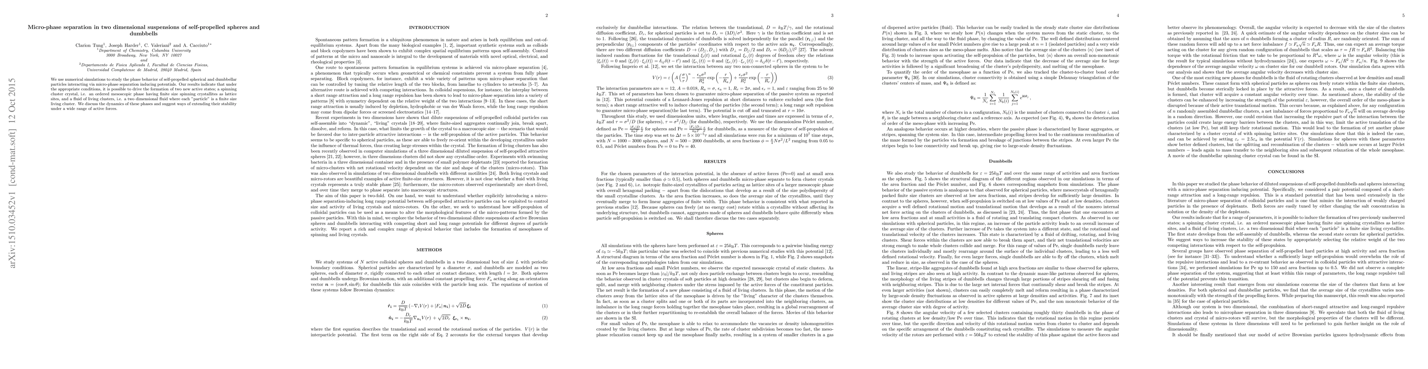 We use numerical simulations to study the phase behavior of self-propelled spherical and dumbbellar particles interacting via micro-phase separation inducing potentials. Our results indicate that under the appropriate conditions, it is possible to drive the formation of two new active states; a spinning cluster crystal, i.e. an ordered mesoscopic phase having finite size spinning crystallites as lattice sites, and a fluid of living clusters, i.e. a two dimensional fluid where each "particle" is a finite size living cluster. We discuss the dynamics of these phases and suggest ways of extending their stability under a wide range of active forces.