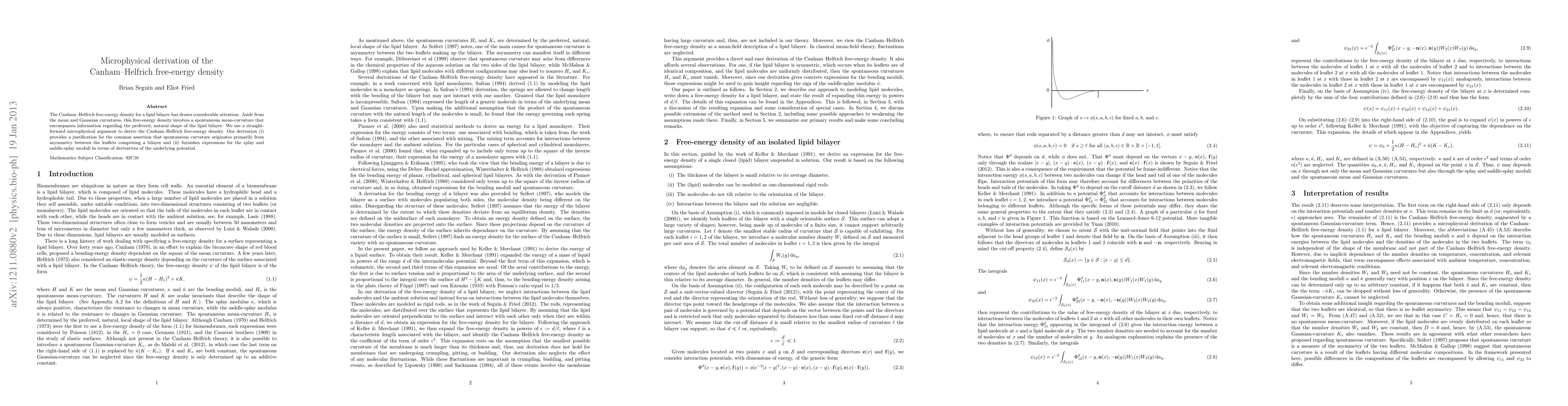 This paper derives the Canham-Helfrich free-energy density for lipid bilayers through a microphysical argument, justifying the spontaneous curvature's origin from leaflet asymmetry and providing expressions for splay and saddle-splay moduli based on the underlying potential.