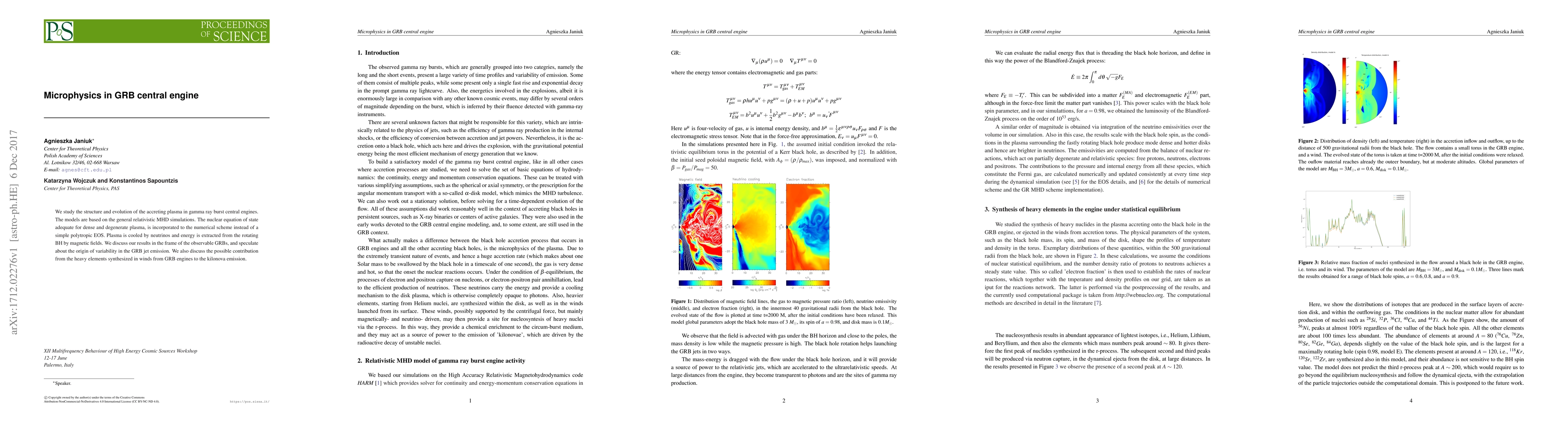 Researchers used general relativistic MHD simulations to study gamma ray burst central engines, finding that magnetic fields extract energy from rotating black holes and cooling plasma via neutrinos. The findings have implications for understanding GRB variability and the origin of heavy elements synthesized in these events.