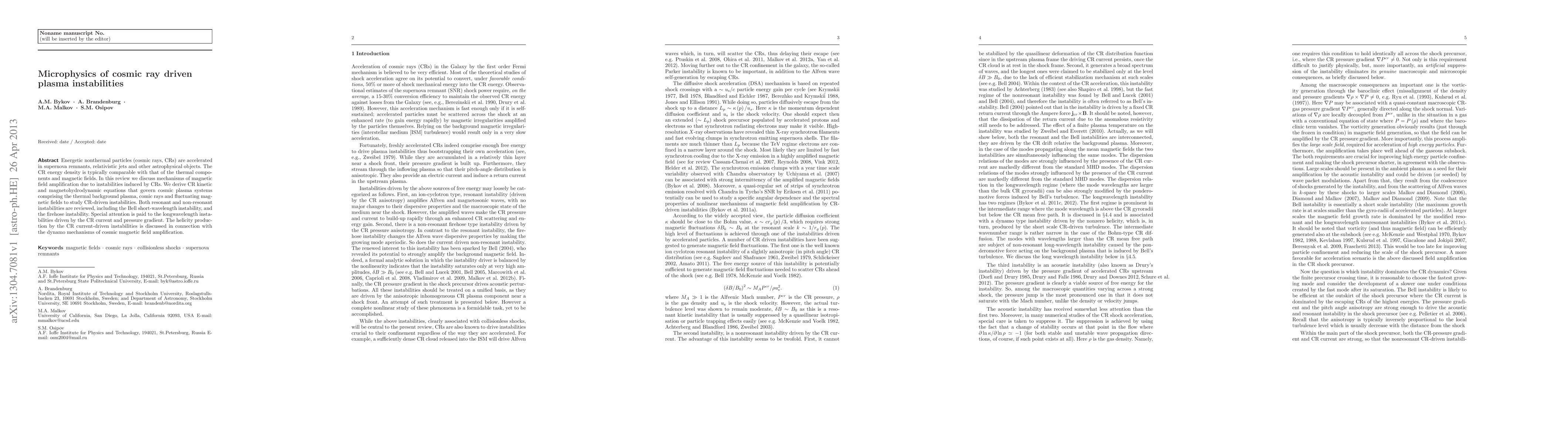This paper reviews mechanisms of magnetic field amplification in cosmic plasmas driven by cosmic ray instabilities, deriving kinetic and magnetohydrodynamic equations to study these interactions. It focuses on both resonant and non-resonant instabilities, including the Bell and firehose instabilities, and discusses the role of cosmic ray currents in magnetic field amplification and helicity production.
