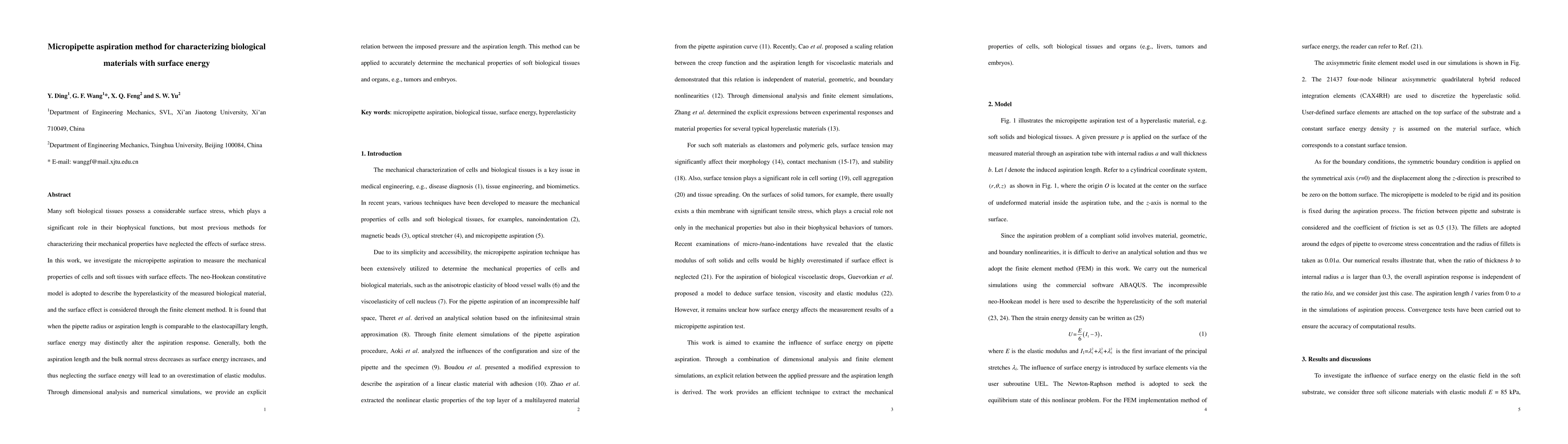 This paper proposes a micropipette aspiration method to characterize the mechanical properties of soft biological tissues, considering surface energy effects. It finds that surface energy significantly influences the aspiration response, leading to an overestimation of elastic modulus if neglected, and provides a relation between pressure and aspiration length for accurate tissue characterization.