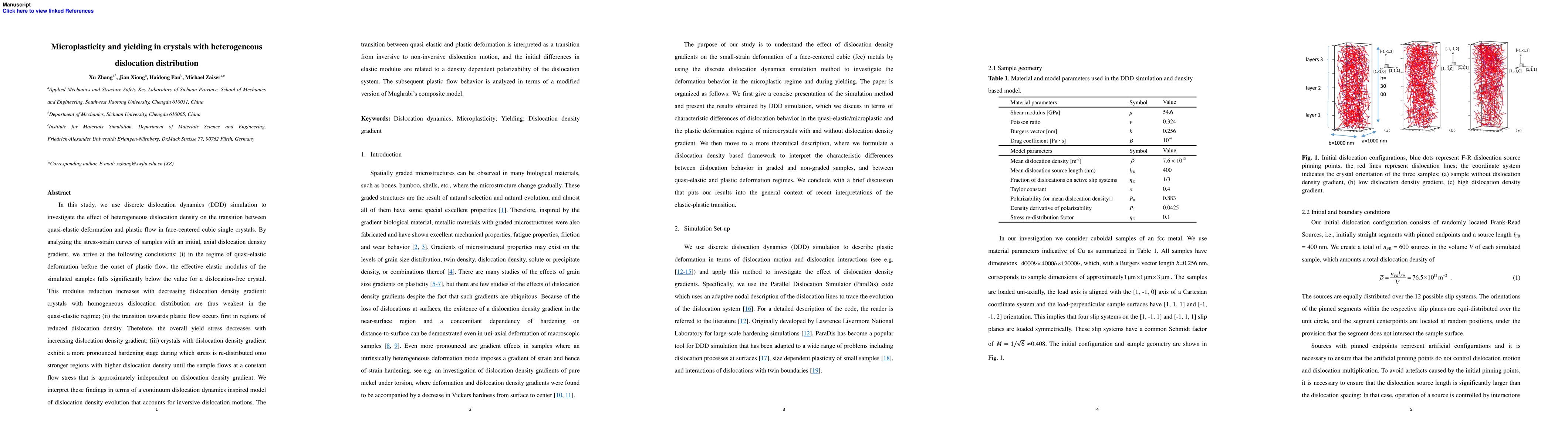 In this study, we use discrete dislocation dynamics (DDD) simulation to investigate the effect of heterogeneous dislocation density on the transition between quasi-elastic deformation and plastic flow in face-centered cubic single crystals. By analyzing the stress-strain curves of samples with an initial, axial dislocation density gradient, we arrive at the following conclusions: (i) in the regime of quasi-elastic deformation before the onset of plastic flow, the effective elastic modulus of the simulated samples falls significantly below the value for a dislocation-free crystal. This modulus reduction increases with decreasing dislocation density gradient: crystals with homogeneous dislocation distribution are thus weakest in the quasi-elastic regime; (ii) the transition towards plastic flow occurs first in regions of reduced dislocation density. Therefore, the overall yield stress decreases with increasing dislocation density gradient; (iii) crystals with dislocation density gradient exhibit a more pronounced hardening stage during which stress is re-distributed onto stronger regions with higher dislocation density until the sample flows at a constant flow stress that is approximately independent on dislocation density gradient. We interpret these findings in terms of a continuum dislocation dynamics inspired model of dislocation density evolution that accounts for inversive dislocation motions. The transition between quasi-elastic and plastic deformation is interpreted as a transition from inversive to non-inversive dislocation motion, and the initial differences in elastic modulus are related to a density dependent polarizability of the dislocation system. The subsequent plastic flow behavior is analyzed in terms of a modified version of Mughrabi's composite model.