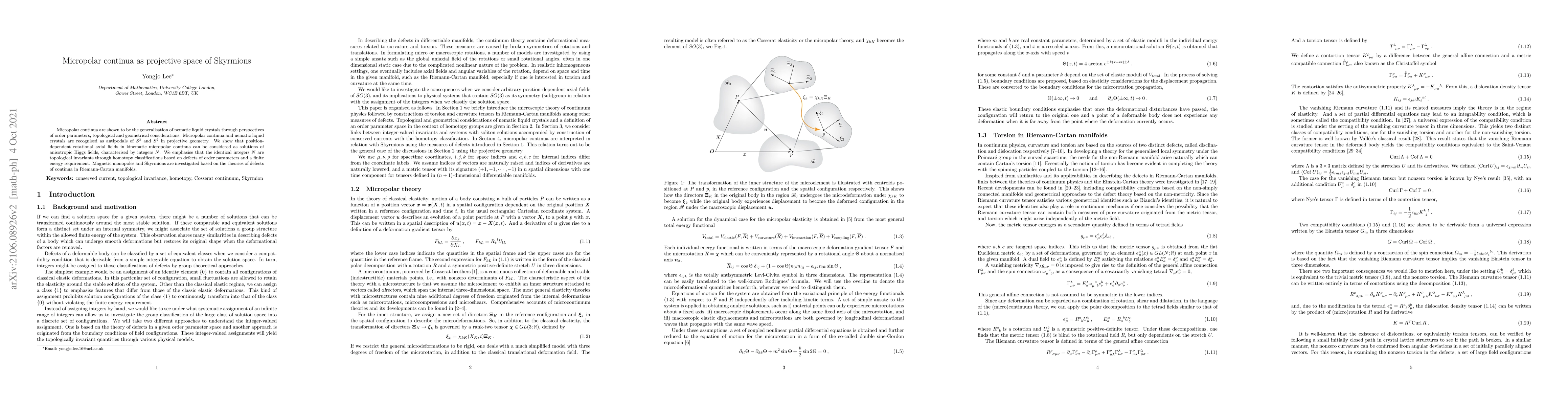 Micropolar continua are shown to be the generalisation of the nematic liquid crystals through perspectives of order parameters, topological and geometrical considerations. Micropolar continua and nematic liquid crystals are recognised as the antipodals of $S^3$ and $S^2$ in projective geometry. We show that position-dependent rotational axial fields in kinematic micropolar continua can be considered as solutions of anisotropic Higgs fields, characterised by integers N. We emphasise that the identical integers N are topological invariants through homotopy classifications based on defects of order parameters and a finite energy requirement. Magnetic monopoles and Skyrmions are investigated based on the theories of defects of continua in Riemann-Cartan manifolds.