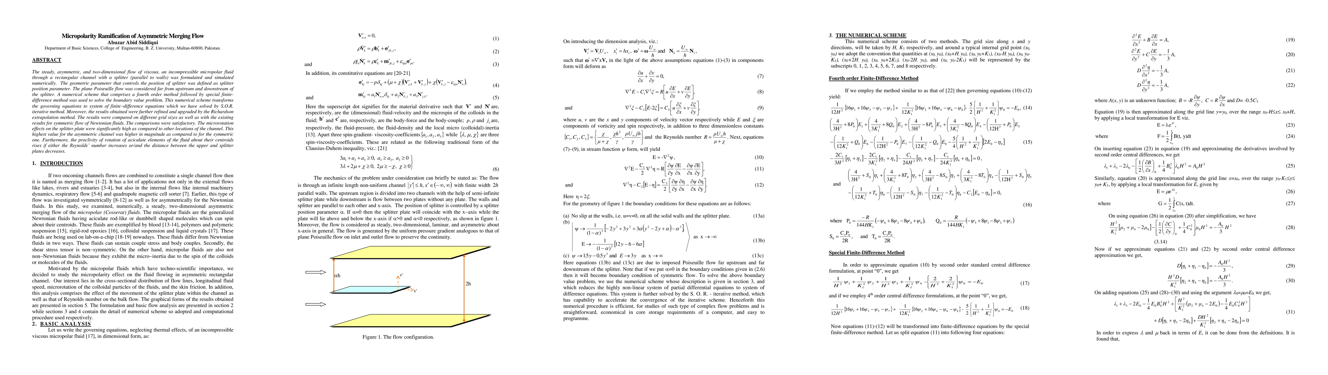 The steady, asymmetric and two-dimensional flow of viscous, incompressible micropolar fluid through a rectangular channel with a splitter (parallel to walls) was formulated and simulated numerically. The plane Poiseuille flow was considered far from upstream and downstream of the splitter. The geometric parameter that controls the position of splitter was defined as splitter position parameter. A numerical scheme that comprises a fourth order method followed by special finite-difference method was used to solve the boundary value problem. This numerical scheme transforms the governing equations to system of finite difference equations which we have solved by SOR iterative method. Moreover, the results obtained were further refined and upgraded by the Richardson extrapolation method. The results were compared on different grid sizes as well as with the existing results for symmetric flow of Newtonian fluids. The comparisons were satisfactory. The microrotation effects on the splitter plate were significantly high as compared to other locations of the channel. This highest value for the asymmetric channel was higher in magnitude as compared to for the symmetric one. Furthermore, the proclivity of rotation of aciculate elements of the fluid about their centroids rises if either the Reynolds' number increases or/and the distance between the upper and splitter plates decreases.
