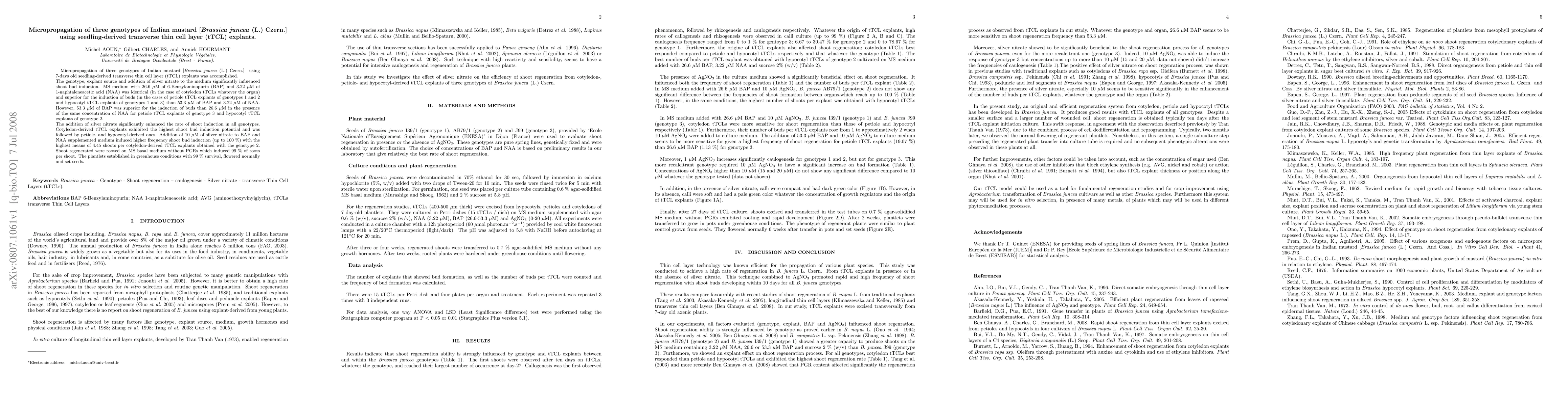 Micropropagation of three genotypes of Indian mustard [\textit{Brassica juncea} (L.) Czern.] using 7-days old seedling-derived transverse thin cell layer (tTCL) explants was accomplished. The genotype, explant source and addition of silver nitrate to the medium significantly influenced shoot bud induction. MS medium with 26.6 $\mu$M of 6-Benzylaminopurin (BAP) and 3.22 $\mu$M of 1-naphtaleneacetic acid (NAA) was identical (in the case of cotyledon tTCLs whatever the organ) and superior for the induction of buds (in the cases of petiole tTCL explants of genotypes 1 and 2 and hypocotyl tTCL explants of genotypes 1 and 3) than 53.3 $\mu$M of BAP and 3.22 $\mu$M of NAA. However, 53.3 $\mu$M of BAP was superior for the induction of buds than 26.6 $\mu$M in the presence of the same concentration of NAA for petiole tTCL explants of genotype 3 and hypocotyl tTCL explants of genotype 2. The addition of silver nitrate significantly enhanced the rate of shoot induction in all genotypes. Cotyledon-derived tTCL explants exhibited the highest shoot bud induction potential and was followed by petiole- and hypocotyl-derived ones. Addition of 10 $\mu$M of silver nitrate to BAP and NAA supplemented medium induced higher frequency shoot bud induction (up to 100 %) with the highest means of 4.45 shoots per cotyledon-derived tTCL explants obtained with the genotype 2. Shoot regenerated were rooted on MS basal medium without PGRs which induced 99 % of roots per shoot. The plantlets established in greenhouse conditions with 99 % survival, flowered normally and set seeds.