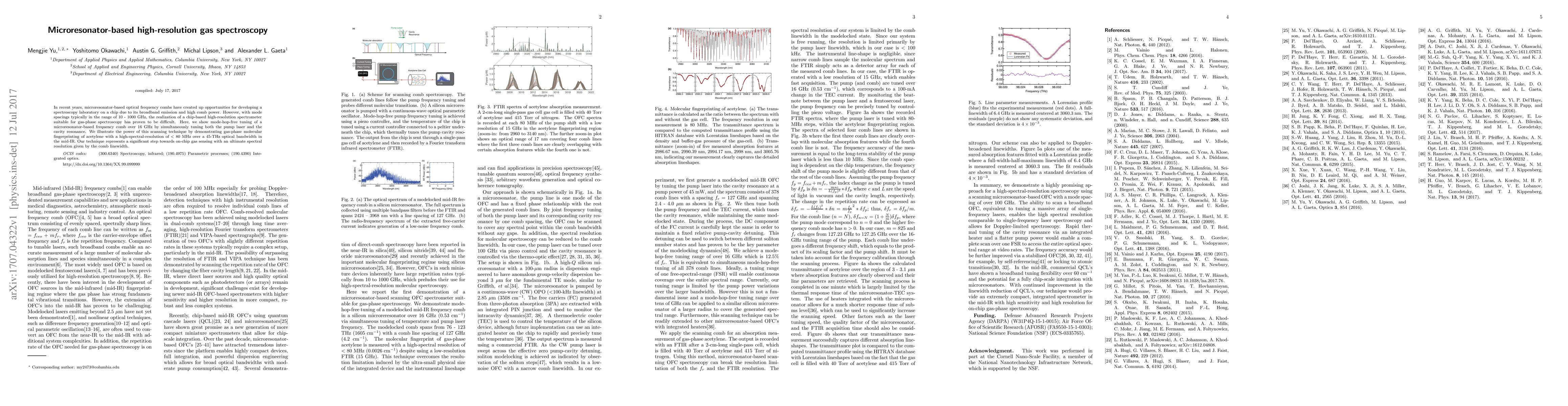This paper demonstrates a microresonator-based frequency comb for high-resolution gas spectroscopy, achieving mode-hop-free tuning over 16 GHz, and successfully identifies acetylene molecules in gas phase with spectral resolution of < 80 MHz. The technique advances on-chip gas sensing capabilities.