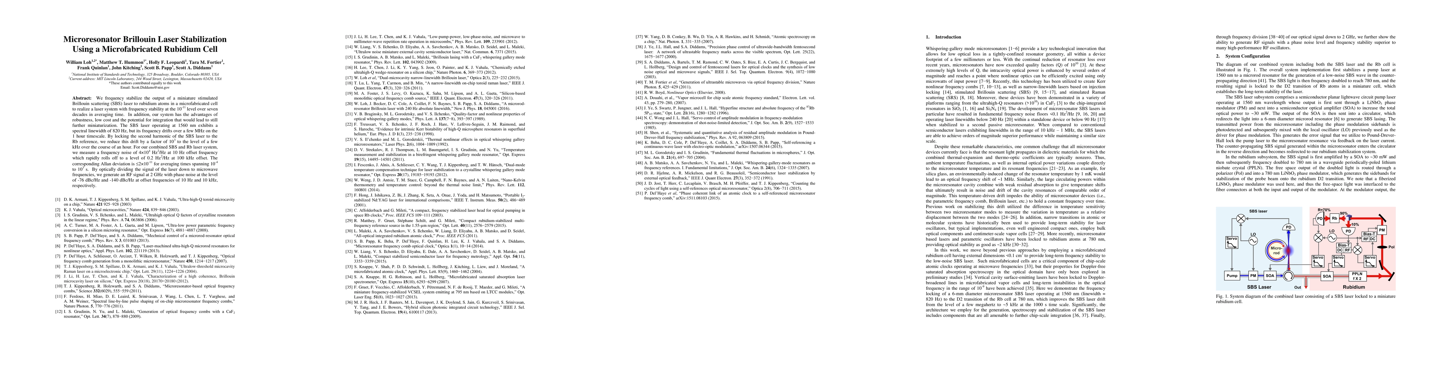 This paper describes a method to stabilize the frequency of a miniature stimulated Brillouin scattering laser using a microfabricated rubidium cell, achieving frequency stability at the $10^{-11}$ level. The system reduces frequency drift by a factor of $10^3$ and demonstrates low phase noise at microwave frequencies.