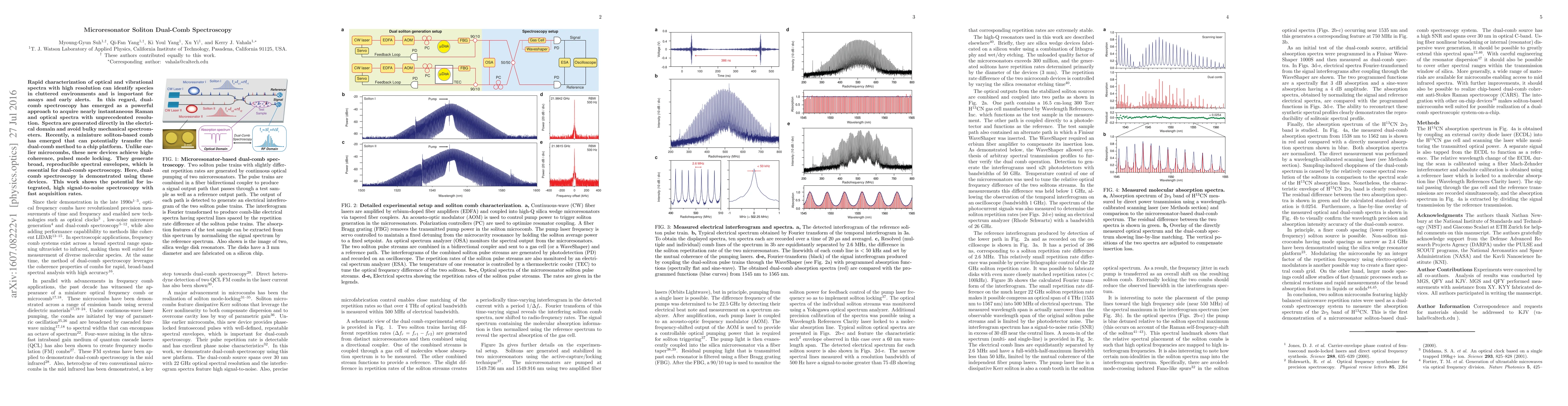 This paper presents the use of microresonator soliton-based combs for dual-comb spectroscopy, demonstrating high-resolution, rapid optical and vibrational spectrum acquisition suitable for species identification in complex environments. The technology promises integrated, high signal-to-noise spectroscopy on a chip with fast data acquisition.