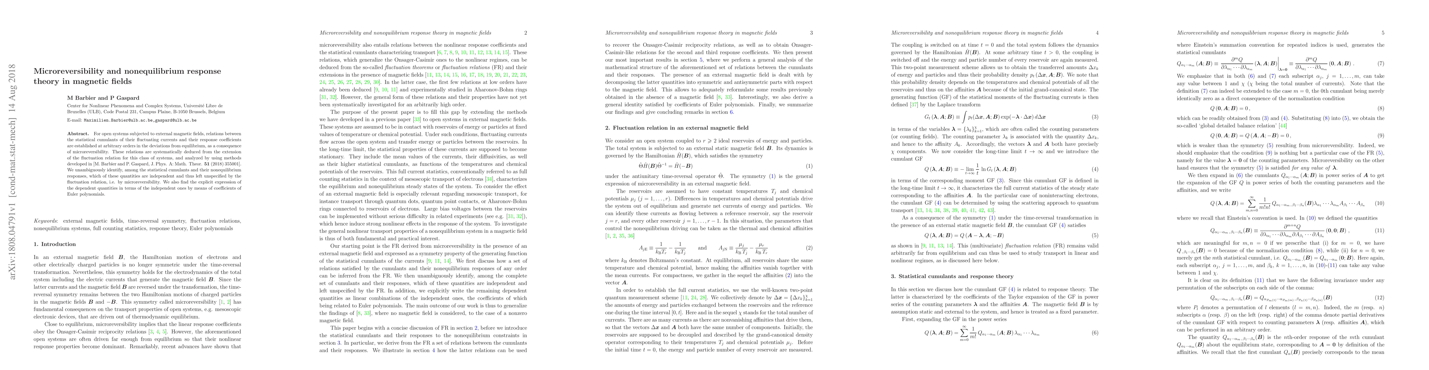 This paper establishes relations between statistical cumulants of fluctuating currents and response coefficients in open systems under magnetic fields, derived from microreversibility and fluctuation relations. It identifies independent quantities among these and expresses dependent ones using coefficients of Euler polynomials.
