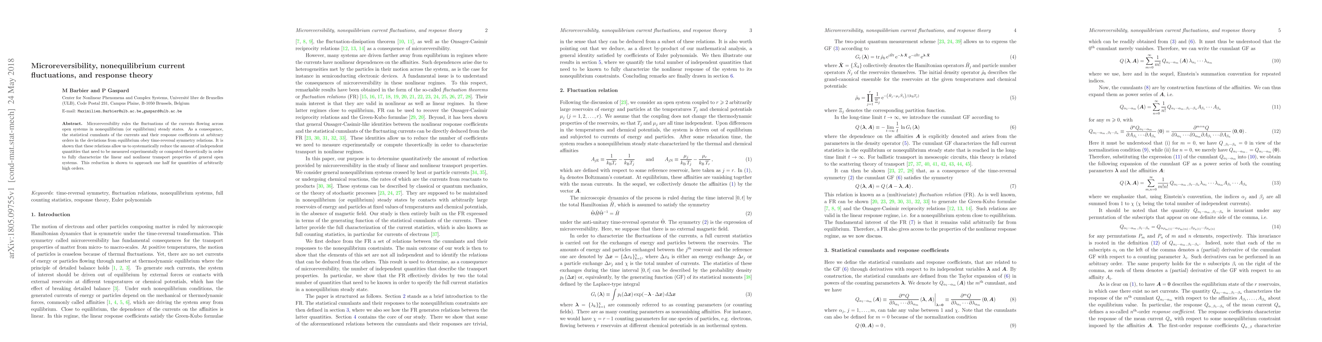 This paper explores how microreversibility governs current fluctuations in open systems, revealing time-reversal symmetry in statistical cumulants and response coefficients. It demonstrates that these symmetries can significantly reduce the number of independent quantities needed to characterize transport properties, approaching half for high-order quantities.