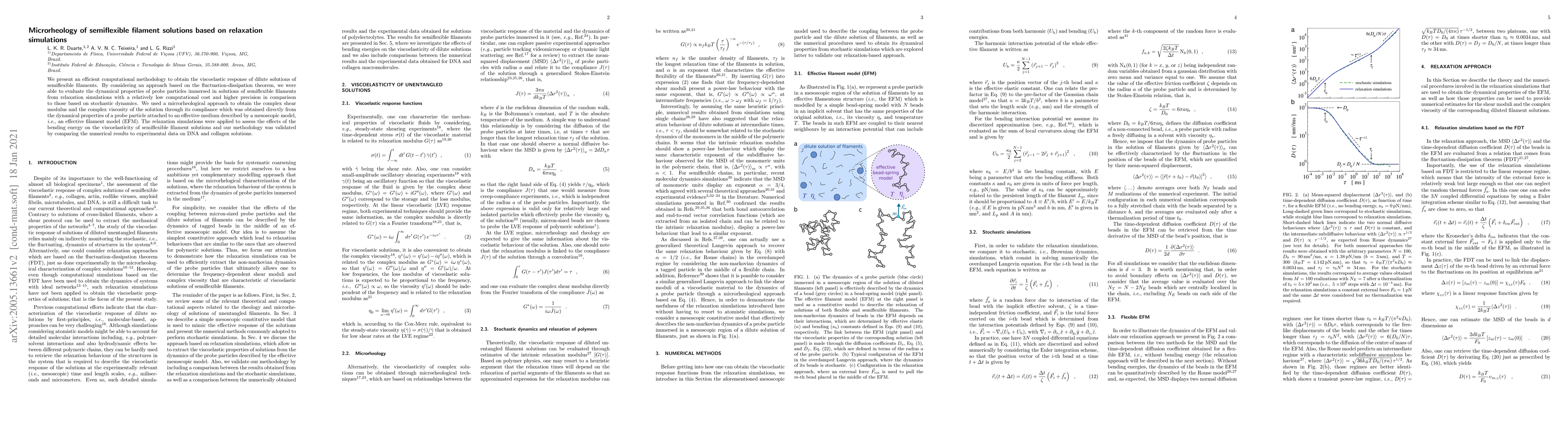 We present an efficient computational methodology to obtain the viscoelastic response of dilute solutions of semiflexible filaments. By considering an approach based on the fluctuation-dissipation theorem, we were able to evaluate the dynamical properties of probe particles immersed in solutions of semiflexible filaments from relaxation simulations with a relatively low computational cost and higher precision in comparison to those based on stochastic dynamics. We used a microrheological approach to obtain the complex shear modulus and the complex viscosity of the solution through its compliance which was obtained directly from the dynamical properties of a probe particle attached to an effective medium described by a mesoscopic model, i.e., an effective filament model (EFM). The relaxation simulations were applied to assess the effects of the bending energy on the viscoelasticity of semiflexible filament solutions and our methodology was validated by comparing the numerical results to experimental data on DNA and collagen solutions.