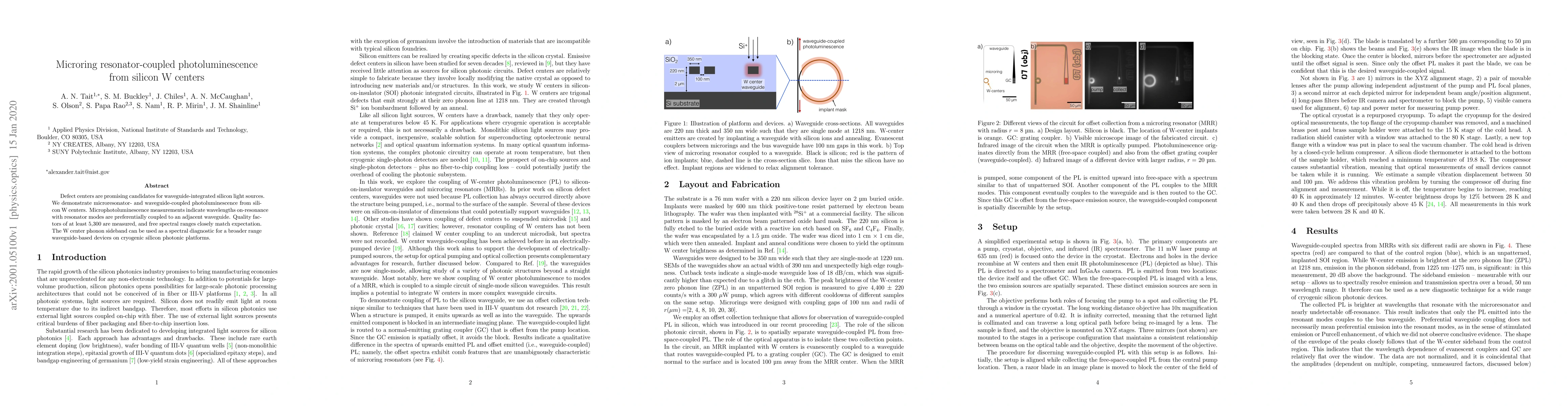 Defect centers are promising candidates for waveguide-integrated silicon light sources. We demonstrate microresonator- and waveguide-coupled photoluminescence from silicon W~centers. Microphotoluminescence measurements indicate wavelengths on-resonance with resonator modes are preferentially coupled to an adjacent waveguide. Quality factors of at least 5,300 are measured, and free spectral ranges closely match expectation. The W~center phonon sideband can be used as a spectral diagnostic for a broader range waveguide-based devices on cryogenic silicon photonic platforms.