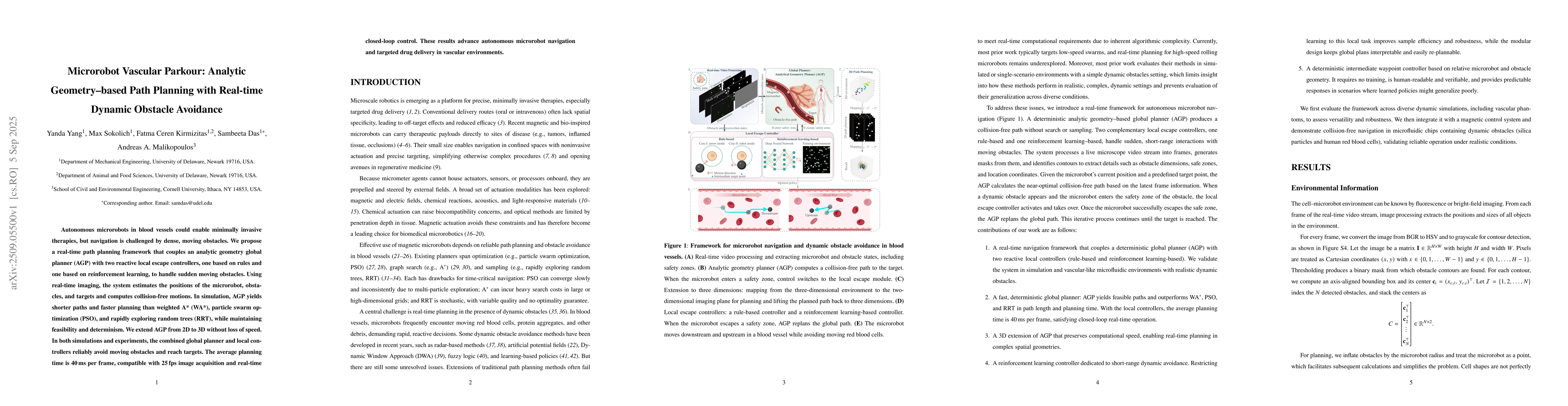 Autonomous microrobots in blood vessels could enable minimally invasive therapies, but navigation is challenged by dense, moving obstacles. We propose a real-time path planning framework that couples an analytic geometry global planner (AGP) with two reactive local escape controllers, one based on rules and one based on reinforcement learning, to handle sudden moving obstacles. Using real-time imaging, the system estimates the positions of the microrobot, obstacles, and targets and computes collision-free motions. In simulation, AGP yields shorter paths and faster planning than weighted A* (WA*), particle swarm optimization (PSO), and rapidly exploring random trees (RRT), while maintaining feasibility and determinism. We extend AGP from 2D to 3D without loss of speed. In both simulations and experiments, the combined global planner and local controllers reliably avoid moving obstacles and reach targets. The average planning time is 40 ms per frame, compatible with 25 fps image acquisition and real-time closed-loop control. These results advance autonomous microrobot navigation and targeted drug delivery in vascular environments.