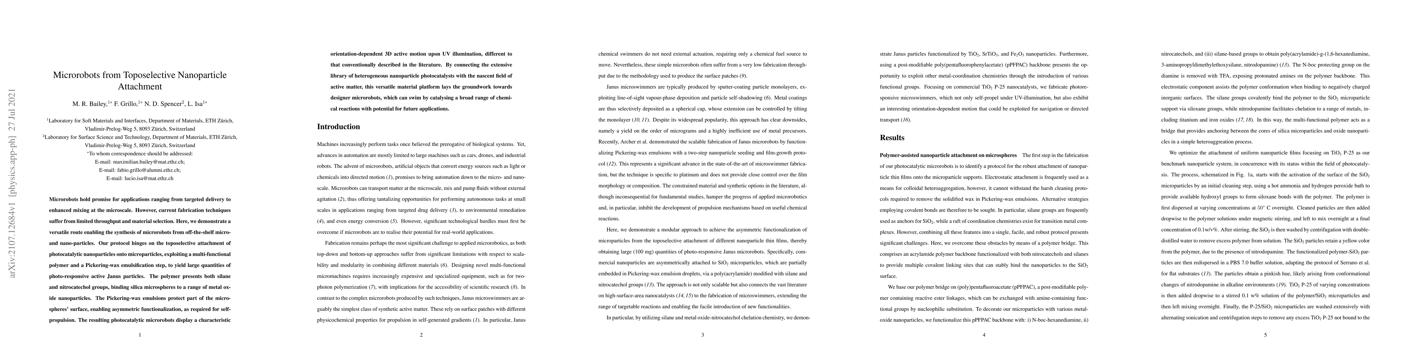 This paper presents a novel method for synthesizing microrobots using toposelective nanoparticle attachment, enabling large-scale production and diverse material selection. The approach leverages a multi-functional polymer and Pickering-wax emulsions to create photo-responsive Janus particles with unique 3D active motion under UV light.