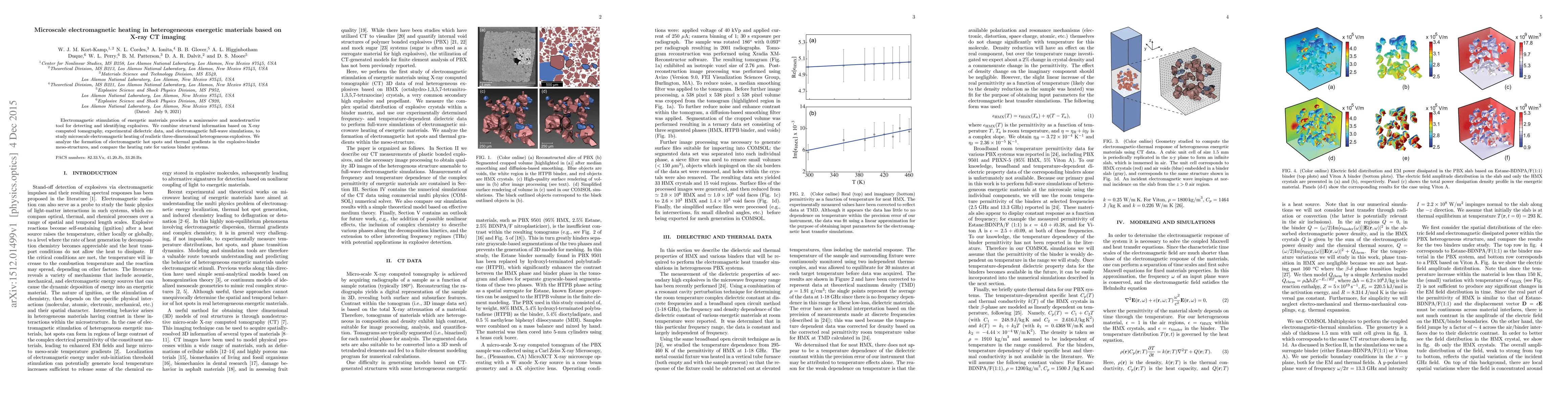 Electromagnetic stimulation of energetic materials provides a noninvasive and nondestructive tool for detecting and identifying explosives. We combine structural information based on X-ray computed tomography, experimental dielectric data, and electromagnetic full-wave simulations, to study microscale electromagnetic heating of realistic three-dimensional heterogeneous explosives. We analyze the formation of electromagnetic hot spots and thermal gradients in the explosive-binder meso-structures, and compare the heating rate for various binder systems.
