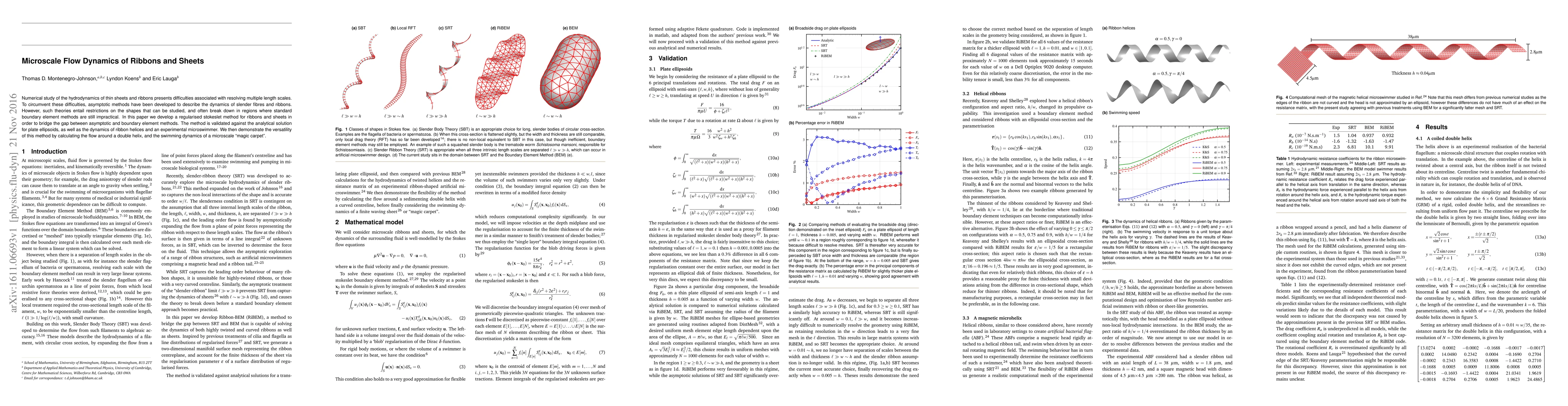 This paper introduces a regularised stokeslet method for analyzing microscale flow dynamics of thin sheets and ribbons, bridging the gap between asymptotic and boundary element methods. The method is validated through comparisons with analytical solutions and experiments, then applied to complex structures like double helices and microswimmers.