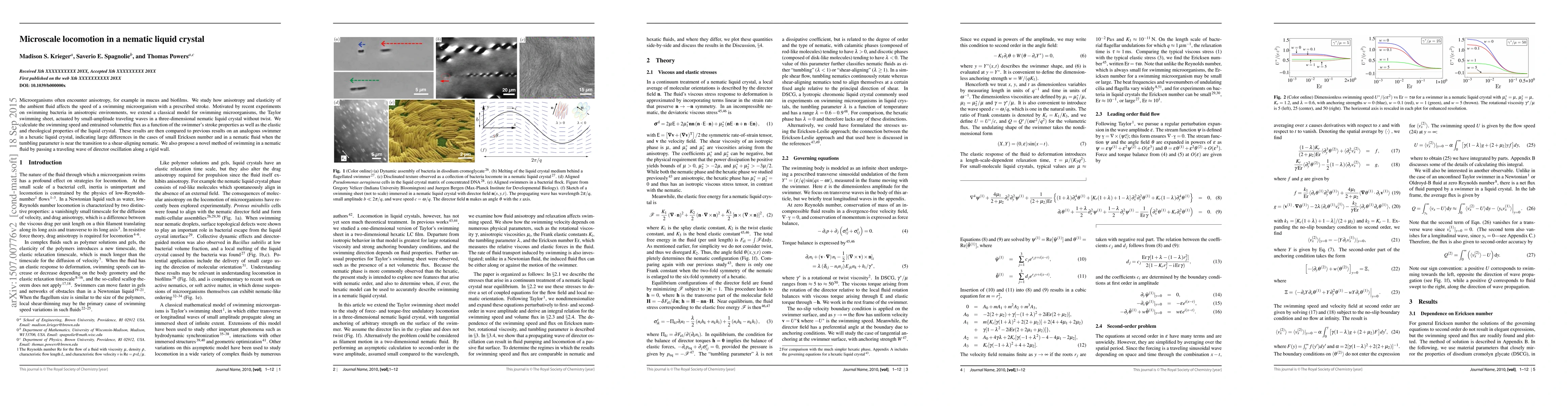 The study extends the Taylor swimming sheet model to a three-dimensional nematic liquid crystal without twist, analyzing the swimming speed and entrained volumetric flux as a function of stroke properties and liquid crystal elastic and rheological properties.