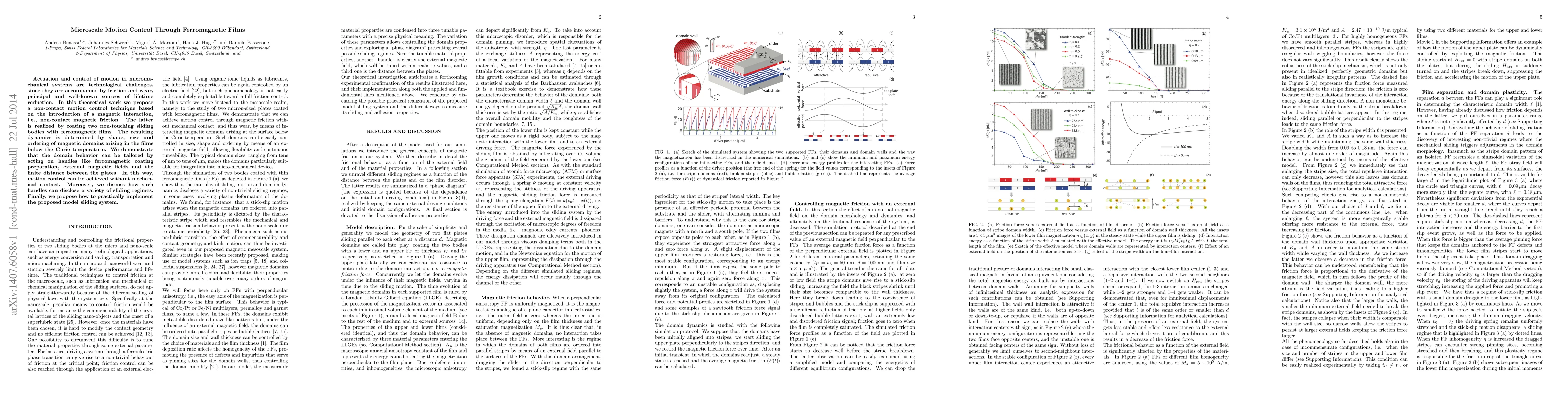 Actuation and control of motion in micro-mechanical systems are technological challenges, since they are accompanied by mechanical friction and wear, principal and well known sources of device lifetime reduction. In this theoretical work we propose a non-contact motion control technique based on the introduction of a tunable magnetic interaction. The latter is realized by coating two non-touching sliding bodies with ferromagnetic films. The resulting dynamics is determined by shape, size and ordering of magnetic domains arising in the films below the Curie temperature. We demonstrate that the domain behavior can be tailored by acting on handles like ferromagnetic coating preparation, external magnetic fields and the finite distance between the plates. In this way, motion control can be achieved without mechanical contact. Moreover, we discuss how such handles can disclose a variety of sliding regimes. Finally, we propose how to practically implement the proposed model sliding system.
