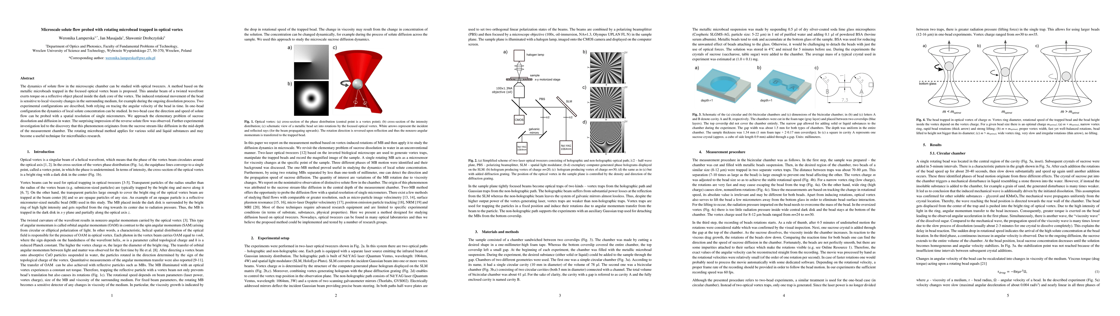 This paper proposes a method using metallic microbeads trapped in an optical vortex to study solute flow dynamics in microscale chambers. The method reveals local viscosity changes and solute flow direction and speed with micrometer resolution, demonstrating its potential for microfluidics research.