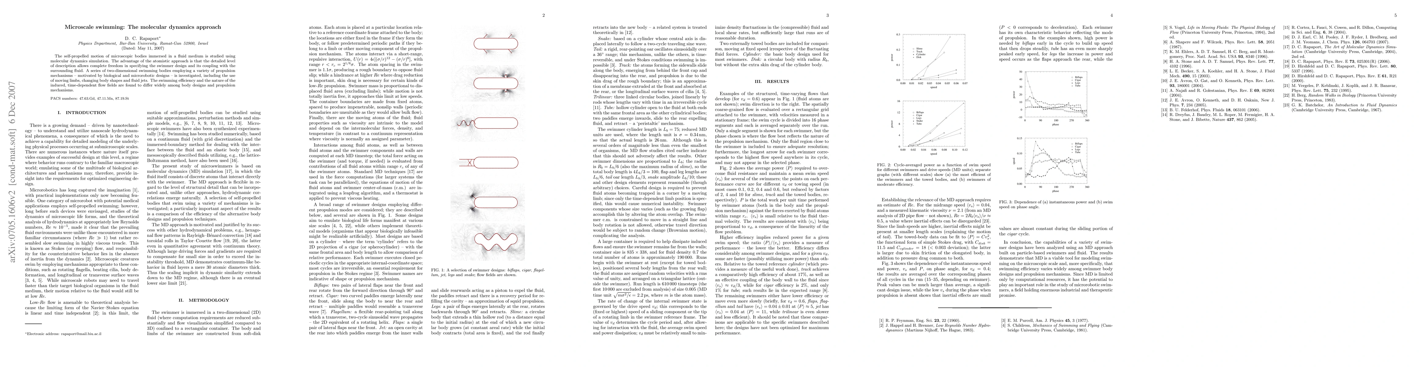 The self-propelled motion of microscopic bodies immersed in a fluid medium is studied using molecular dynamics simulation. The advantage of the atomistic approach is that the detailed level of description allows complete freedom in specifying the swimmer design and its coupling with the surrounding fluid. A series of two-dimensional swimming bodies employing a variety of propulsion mechanisms -- motivated by biological and microrobotic designs -- is investigated, including the use of moving limbs, changing body shapes and fluid jets. The swimming efficiency and the nature of the induced, time-dependent flow fields are found to differ widely among body designs and propulsion mechanisms.