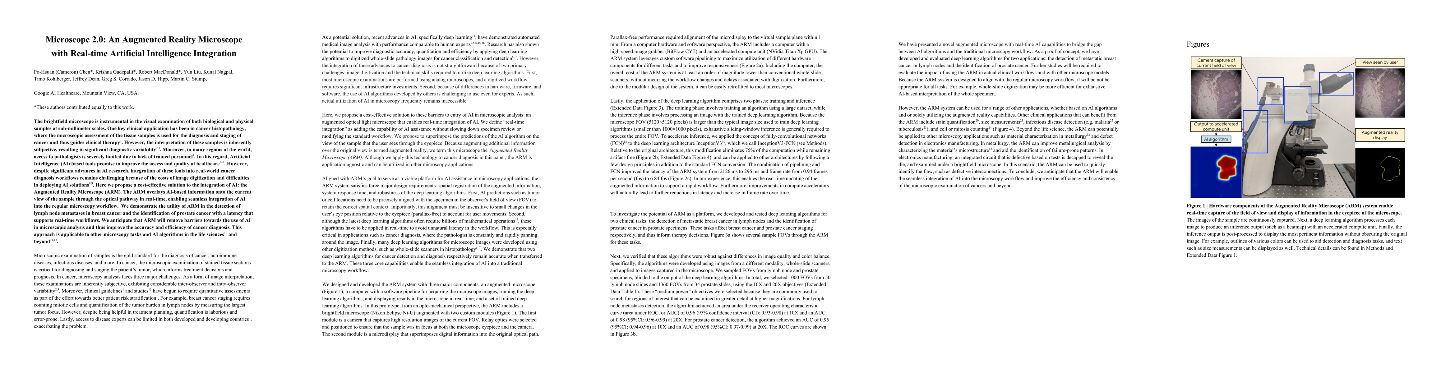 The brightfield microscope is instrumental in the visual examination of both biological and physical samples at sub-millimeter scales. One key clinical application has been in cancer histopathology, where the microscopic assessment of the tissue samples is used for the diagnosis and staging of cancer and thus guides clinical therapy. However, the interpretation of these samples is inherently subjective, resulting in significant diagnostic variability. Moreover, in many regions of the world, access to pathologists is severely limited due to lack of trained personnel. In this regard, Artificial Intelligence (AI) based tools promise to improve the access and quality of healthcare. However, despite significant advances in AI research, integration of these tools into real-world cancer diagnosis workflows remains challenging because of the costs of image digitization and difficulties in deploying AI solutions. Here we propose a cost-effective solution to the integration of AI: the Augmented Reality Microscope (ARM). The ARM overlays AI-based information onto the current view of the sample through the optical pathway in real-time, enabling seamless integration of AI into the regular microscopy workflow. We demonstrate the utility of ARM in the detection of lymph node metastases in breast cancer and the identification of prostate cancer with a latency that supports real-time workflows. We anticipate that ARM will remove barriers towards the use of AI in microscopic analysis and thus improve the accuracy and efficiency of cancer diagnosis. This approach is applicable to other microscopy tasks and AI algorithms in the life sciences and beyond.