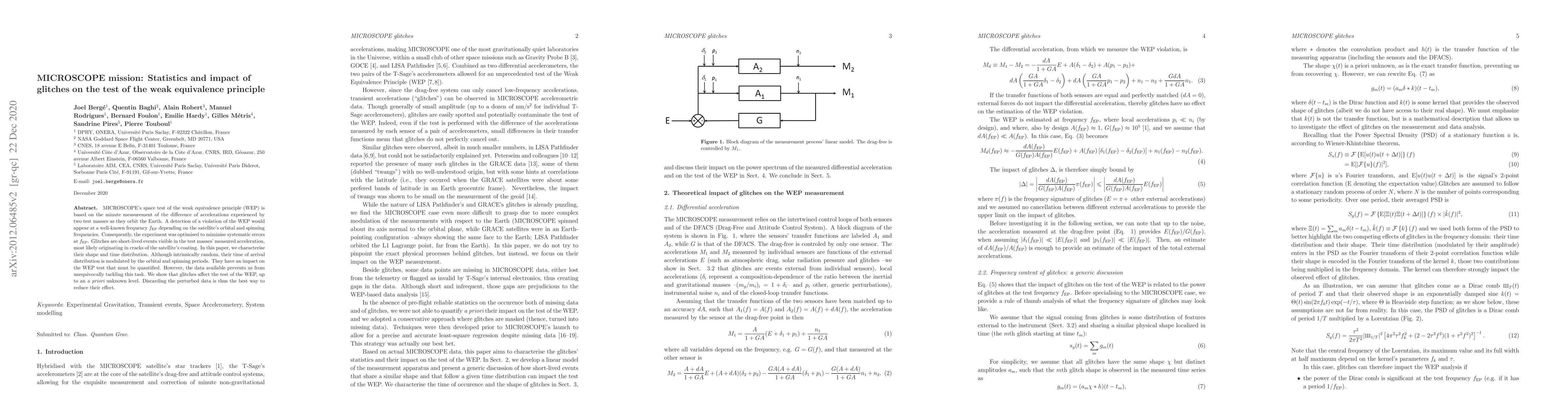 The MICROSCOPE mission tests the weak equivalence principle by measuring the acceleration difference between two test masses. Glitches, likely from satellite coating cracks, affect the test, but their exact impact remains uncertain due to data limitations, necessitating data discarding to mitigate their influence.