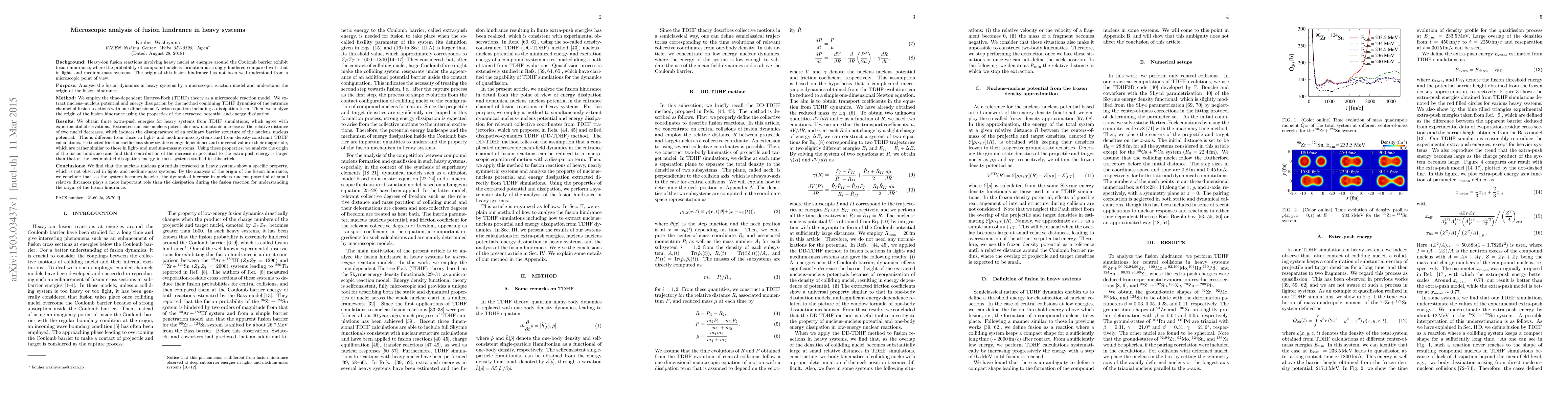 This paper uses time-dependent Hartree-Fock theory to analyze fusion hindrance in heavy-ion reactions, finding that the increase in potential energy at small distances is more significant than energy dissipation in causing fusion hindrance compared to lighter systems.