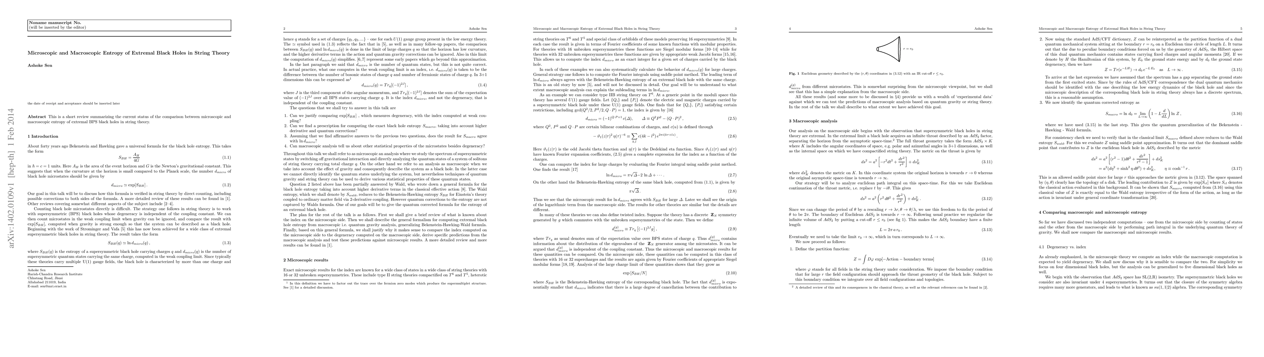 Summary: This review compares the microscopic and macroscopic entropy of extremal BPS black holes in string theory, highlighting the ongoing efforts to reconcile these two perspectives. The paper underscores the significance of understanding black hole entropy in the context of string theory.