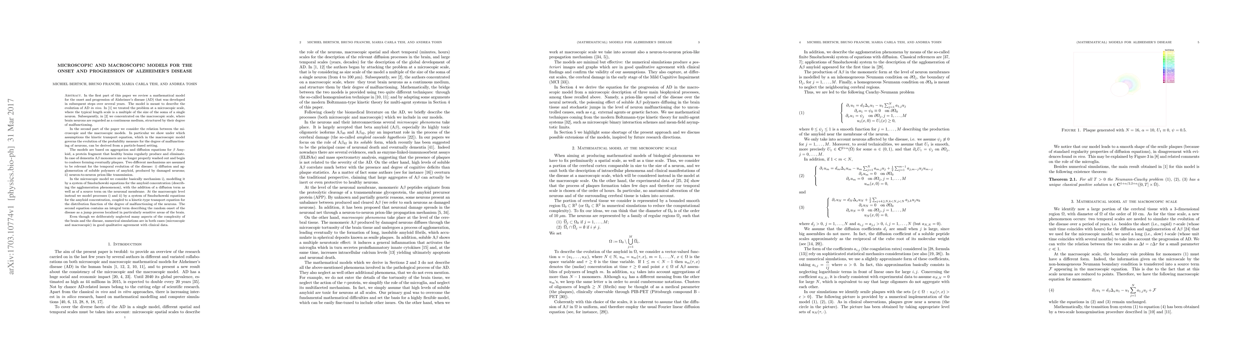 In the first part of this paper we review a mathematical model for the onset and progression of Alzheimer's disease (AD) that was developed in subsequent steps over several years. The model is meant to describe the evolution of AD in vivo. In [Y. Achdou et al., 2013] we treated the problem at a microscopic scale, where the typical length scale is a multiple of the size of the soma of a single neuron. Subsequently, in [M. Bertsch at al., 2016] we concentrated on the macroscopic scale, where brain neurons are regarded as a continuous medium, structured by their degree of malfunctioning. In the second part of the paper we consider the relation between the microscopic and the macroscopic models. In particular we show under which assumptions the kinetic transport equation, which in the macroscopic model governs the evolution of the probability measure for the degree of malfunctioning of neurons, can be derived from a particle-based setting. In the microscopic model we consider basically mechanism i), modelling it by a system of Smoluchowski equations for the amyloid concentration (describing the agglomeration phenomenon), with the addition of a diffusion term as well as of a source term on the neuronal membrane. At the macroscopic level instead we model processes i) and ii) by a system of Smoluchowski equations for the amyloid concentration, coupled to a kinetic-type transport equation for the distribution function of the degree of malfunctioning of the neurons. The second equation contains an integral term describing the random onset of the disease as a jump process localized in particularly sensitive areas of the brain. Even though we deliberately neglected many aspects of the complexity of the brain and the disease, numerical simulations are in both cases (microscopic and macroscopic) in good qualitative agreement with clinical data.