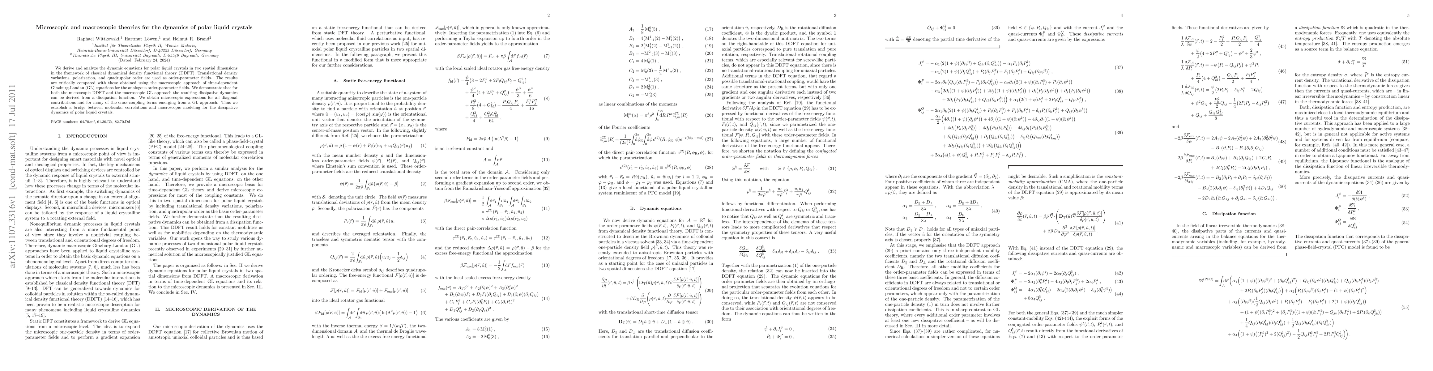 This paper derives and compares dynamic equations for polar liquid crystals using microscopic density functional theory and macroscopic Ginzburg-Landau models, establishing a connection between molecular correlations and macroscopic dynamics. Both approaches yield dissipative dynamics from a dissipation function, providing insights into the underlying mechanisms of polar liquid crystal behavior.
