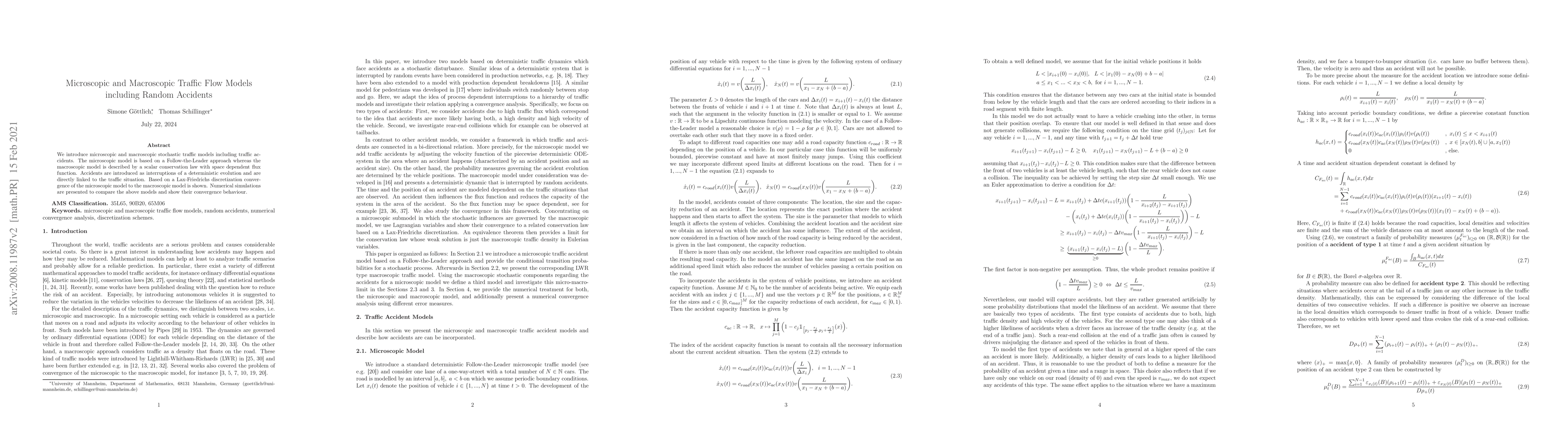 This paper introduces microscopic and macroscopic stochastic traffic flow models incorporating random accidents. The microscopic model uses a Follow-the-Leader approach, while the macroscopic model is a scalar conservation law with a space-dependent flux function, with accidents modeled as interruptions in deterministic traffic evolution. The paper demonstrates convergence of the microscopic model to the macroscopic model via Lax-Friedrichs discretization and presents numerical simulations to illustrate their behavior.