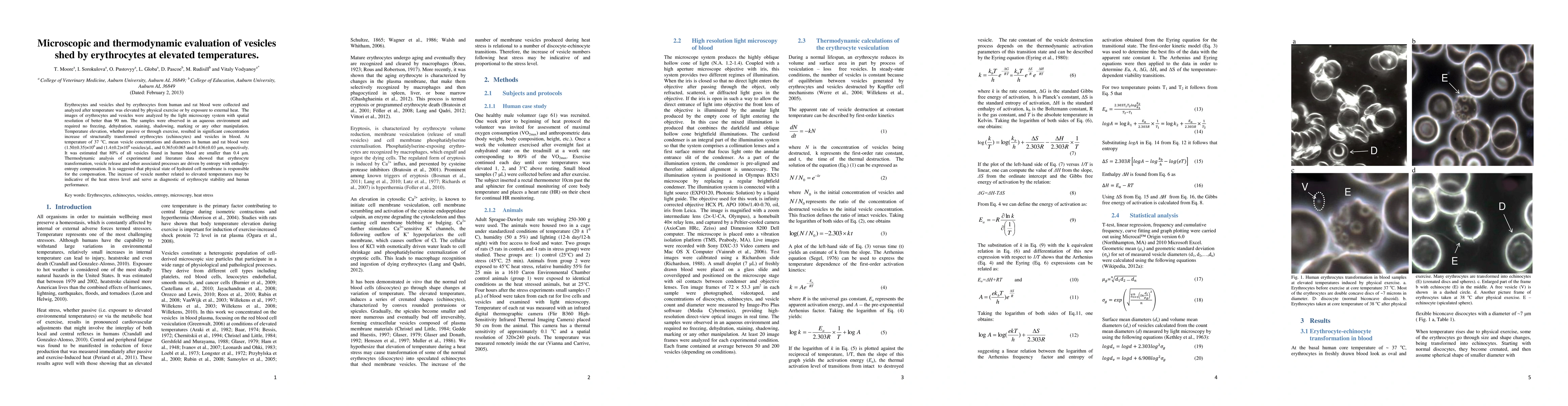 Elevated temperatures caused a significant increase in vesicle concentration and diameter in human and rat blood, indicating heat stress levels. Thermodynamic analysis suggests that entropy drives these changes, potentially serving as an indicator of erythrocyte stability and human performance.