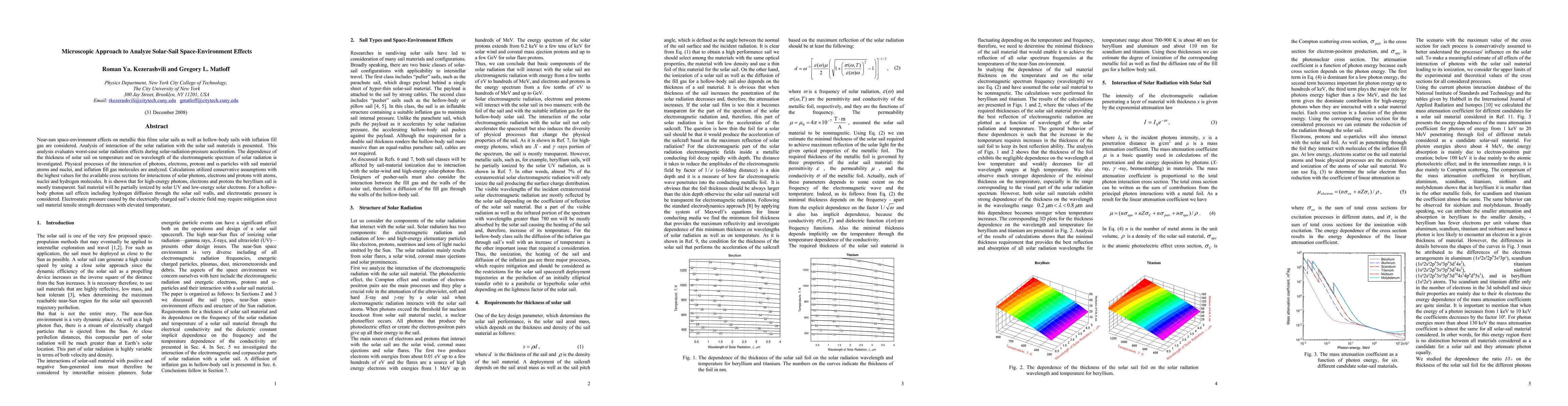 Near-sun space-environment effects on metallic thin films solar sails as well as hollow-body sails with inflation fill gas are considered. Analysis of interaction of the solar radiation with the solar sail materials is presented. This analysis evaluates worst-case solar radiation effects during solar-radiation-pressure acceleration. The dependence of the thickness of solar sail on temperature and on wavelength of the electromagnetic spectrum of solar radiation is investigated. Physical processes of the interaction of photons, electrons, protons and helium nuclei with sail material atoms and nuclei, and inflation fill gas molecules are analyzed. Calculations utilized conservative assumptions with the highest values for the available cross sections for interactions of solar photons, electrons and protons with atoms, nuclei and hydrogen molecules. It is shown that for high-energy photons, electrons and protons the beryllium sail is mostly transparent. Sail material will be partially ionized by solar UV and low-energy solar electrons. For a hollow-body photon sail effects including hydrogen diffusion through the solar sail walls, and electrostatic pressure is considered. Electrostatic pressure caused by the electrically charged sail's electric field may require mitigation since sail material tensile strength decreases with elevated temperature.