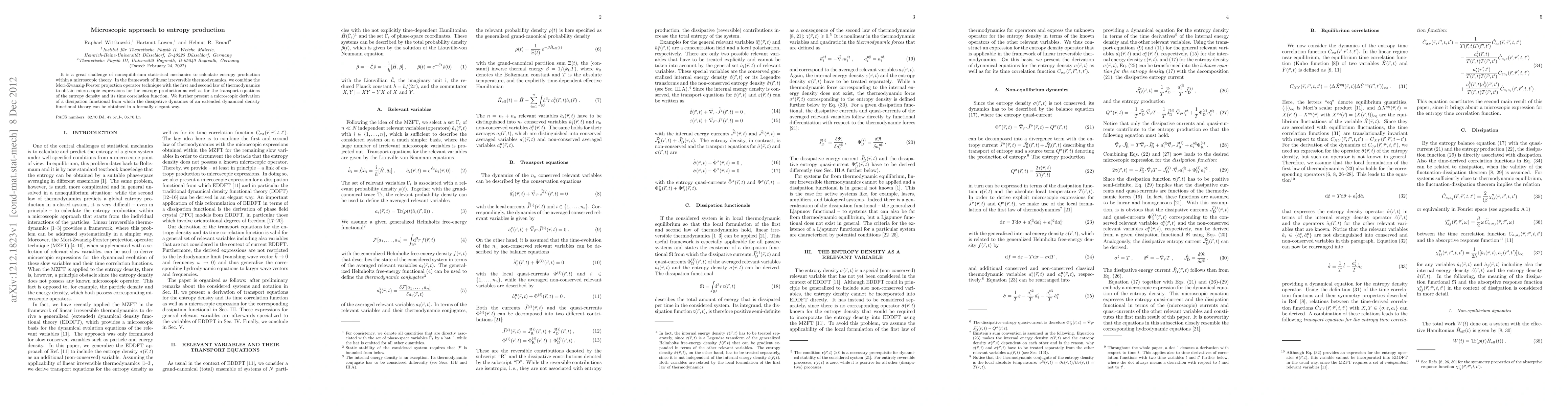 It is a great challenge of nonequilibrium statistical mechanics to calculate entropy production within a microscopic theory. In the framework of linear irreversible thermodynamics, we combine the Mori-Zwanzig-Forster projection operator technique with the first and second law of thermodynamics to obtain microscopic expressions for the entropy production as well as for the transport equations of the entropy density and its time correlation function. We further present a microscopic derivation of a dissipation functional from which the dissipative dynamics of an extended dynamical density functional theory can be obtained in a formally elegant way.