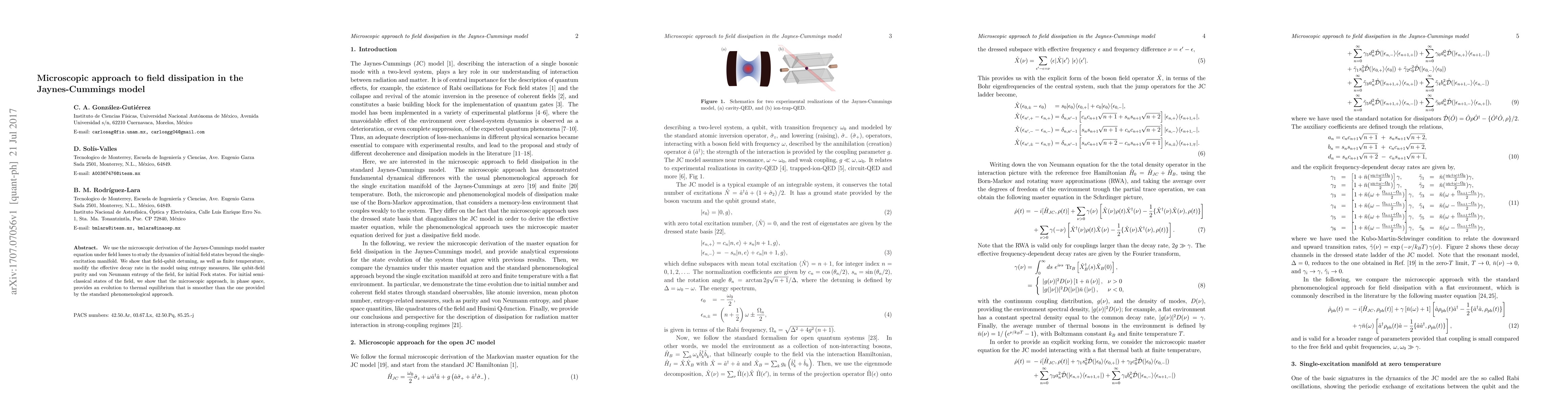 This paper investigates the dynamics of field dissipation in the Jaynes-Cummings model using a microscopic derivation, showing that field-qubit detuning and finite temperature alter the effective decay rate. The study reveals a smoother evolution to thermal equilibrium for semi-classical field states compared to the standard phenomenological approach.