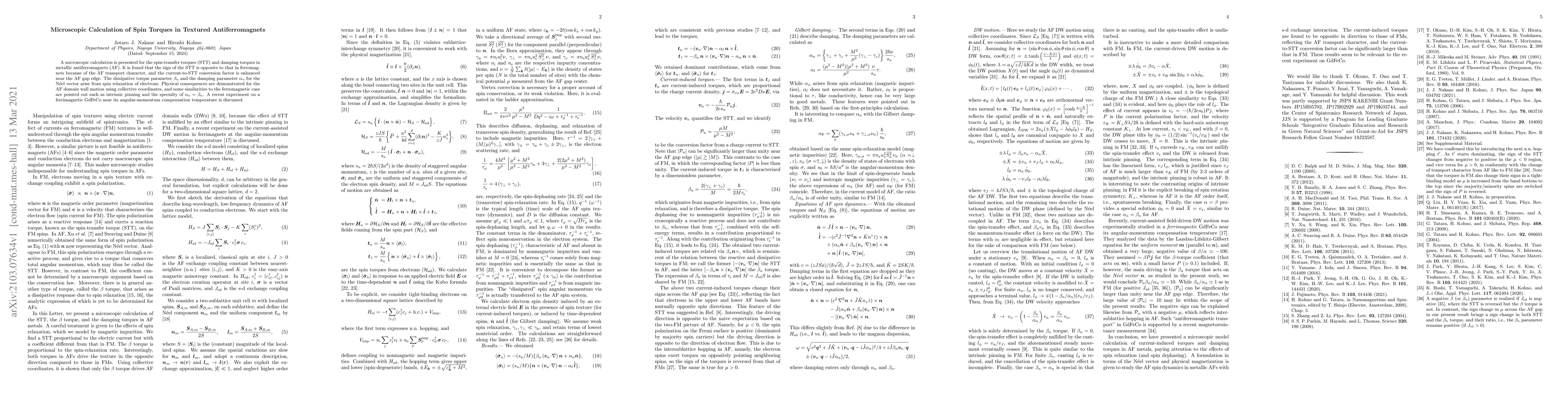 A microscopic calculation is presented for the spin-transfer torques (STT) and damping torques in metallic antiferromagnets (AF). It is found that the sign of the STT is opposite to that in ferromagnets because of the AF transport character, and the current-to-STT conversion factor is enhanced near the AF gap edge. The dissipative torque parameter $\beta_n$ and the damping parameter $\alpha_n$ for the N\'eel vector arise from spin relaxation of electrons. Physical consequences are demonstrated for the AF domain wall motion using collective coordinates, and some similarities to the ferromagnetic case are pointed out such as intrinsic pinning and the specialty of $\alpha_n = \beta_n$. A recent experiment on a ferrimagnetic GdFeCo near its angular-momentum compensation temperature is discussed.